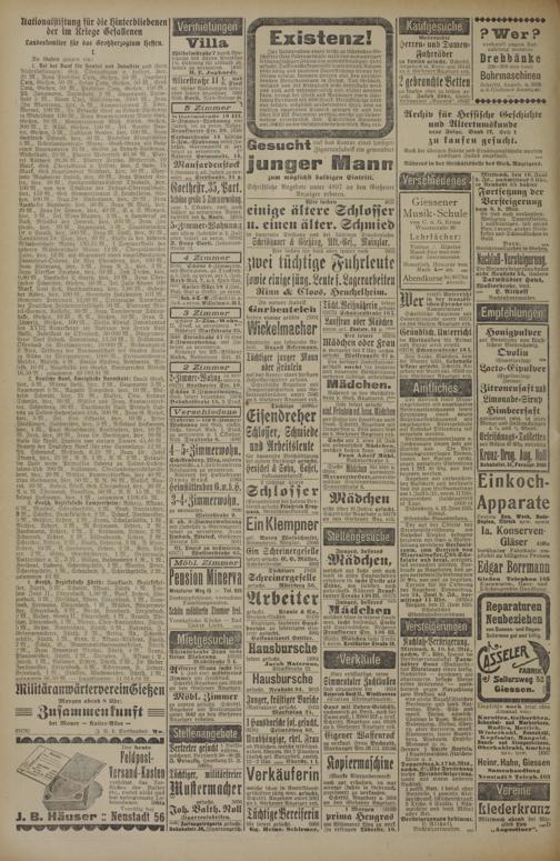 erteilt Unterricht Per in der französi⸗ Konversation? Schriftliche Angebote mit an den Gießen. Anzeiger erb. Gründlich. Unterricht und Beruf wird erteilt 603174] Schanzenstraße 161. die Mutter sehlt, liebevolle Pflege gesucht. Schriftl. An⸗ den Gießener Anzeiger exb. Anftfiches zingebäudes mit angebautem Reiserwellenschuppen sowie Reiserwellenschuppens mit angebautem Abortgebäude vergeben werden. Verdingungsunterlagen u. Einsicht aus. Die Ver⸗ dingungs unterlagen können, gegen portofreie Einsendung von 1 Mk. 40 Pfg. von hier Angebote mit entsprechen⸗ der Aufschrift und versiegelt am 1. Juli d. Js. vorm. 11 Uhr, 1 Zuschie 5050 id Blendung e d. 557 Juni 1915. Eisenbahn⸗ Bauabteilung. Straßenüberführung am Bahnbof Wetzlar belegene leitung versehene Verkaufs⸗ raum, zum Vertrieb von kolade und dergl. geeignet, soll verpachtet werden. Vor⸗ gen portofreie Zusendung von 50 Pfg. von uns zu beziehen. der Angebote: Donnerstag, den 24. Juni d. Js., vor⸗ Weblar, den 12. Juni 1915. Königliches Mersteiheüngen Fersteigerung. nachm. 2½ Ubr, kommt im Versteigerungslokal Darm⸗ das 2 eines hiesig. Nachlasses— A gut erster Kellereien— meist⸗ bietend gegen n eine große eee Bordeaux und sonst. Rot⸗ mouss. Weine, nämlich: Soden le Pope, Ponard, ry, alter Portwein, mouss. Rheinwein, sowie Kupfer⸗ Monopol ꝛc. ꝛc. Ferner 1 Partie Kapseln,