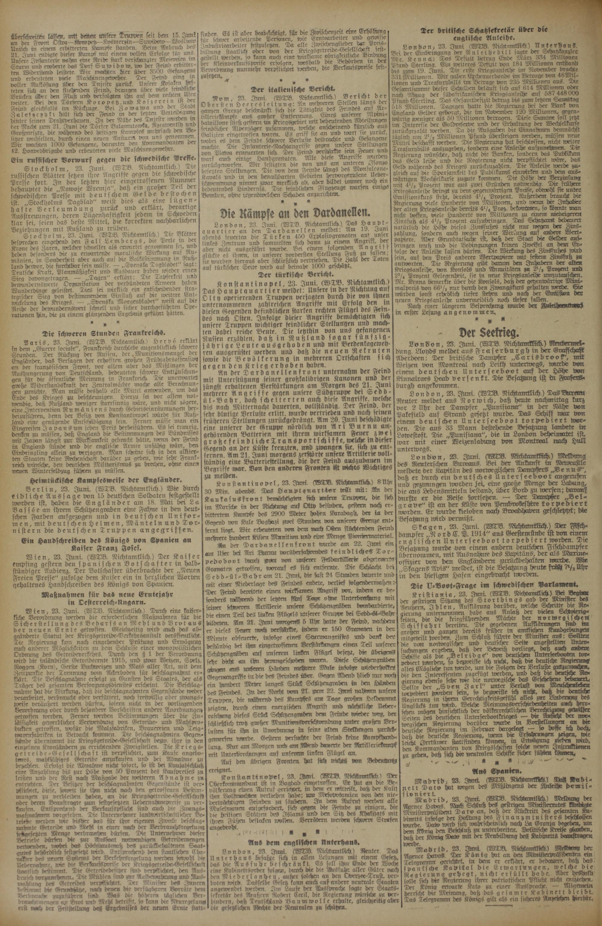 An der Dardanellenfront unternahm der Feind mit Unterstützung seiner großkalibrigen Kanonen und der jüngst erhaltenen Verstärkungen am Morgen des 21. Juni mehrere Angriffe gegen unsere Südgruppe bei Sedd⸗ ül⸗Bahr, doch scheiterten auch diese Angriffe, welche bis nach Mitternacht dauerten, vollständig. Der Feind, der sehr blutige Verluste erlitt, wurde vertrieben und nach seinen früheren Stellungen zurückgedrängt. Am 20. Juni beschädigte eine unserer der Gruppe nördlich von Ari Burnu an⸗ gehörenden Batterien mit ihrem wirksamen Feuer wei großefeindliche Trans portschiffe, welche in diefer Gegend an der Küste kreuzten, und zwangen sie, sich zu ent⸗ fernen. Am 21. Juni morgens zerstörte unsere Artilterie voll. ständig eine Batteriestellung, die der Feind auszubauen im Begriffe war. Von den anderen Fronten ist nichts Wichtiges zu melden.