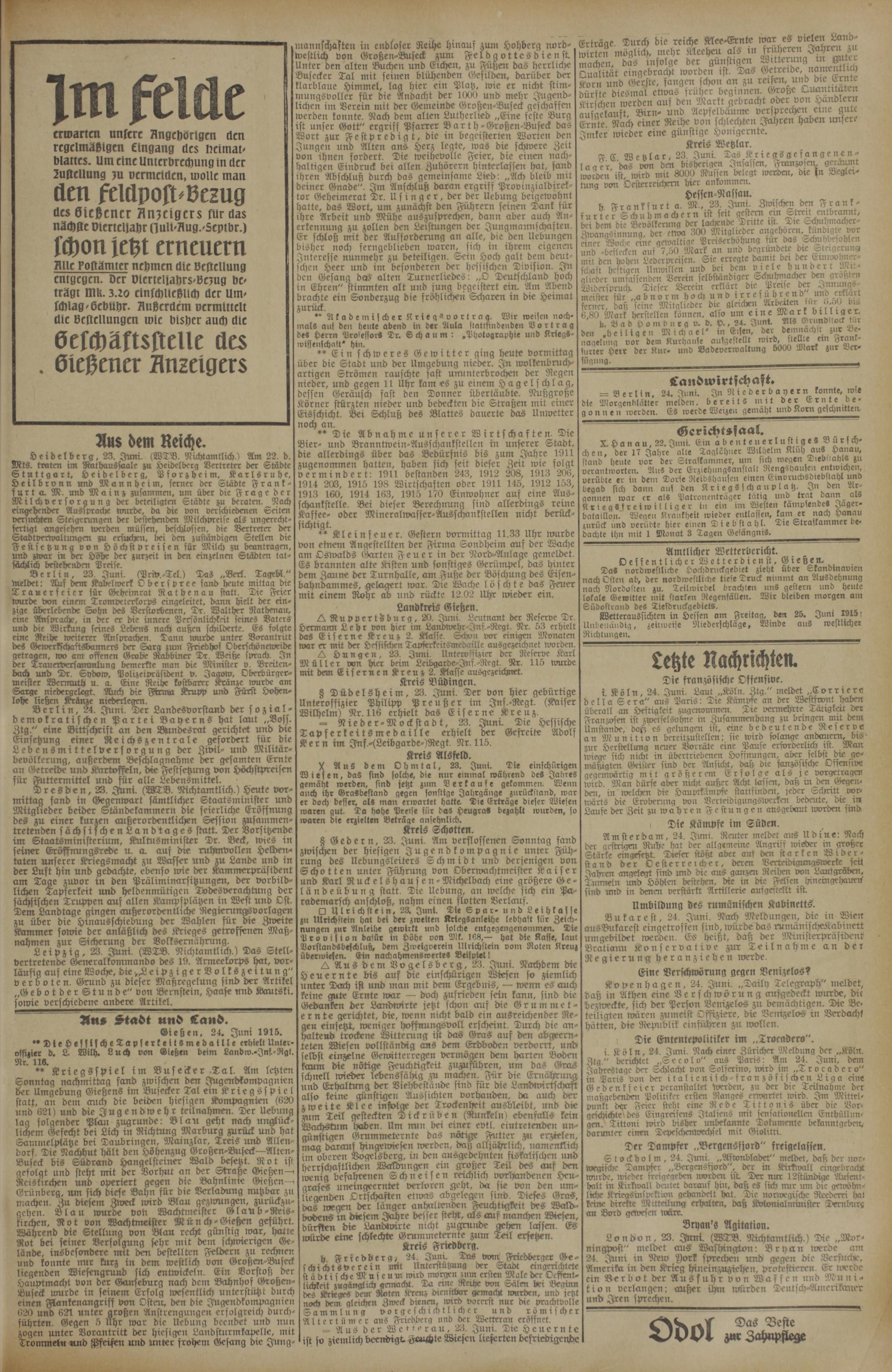 Aus Stadt und Cand. Gießen, 24. Juni 1915.