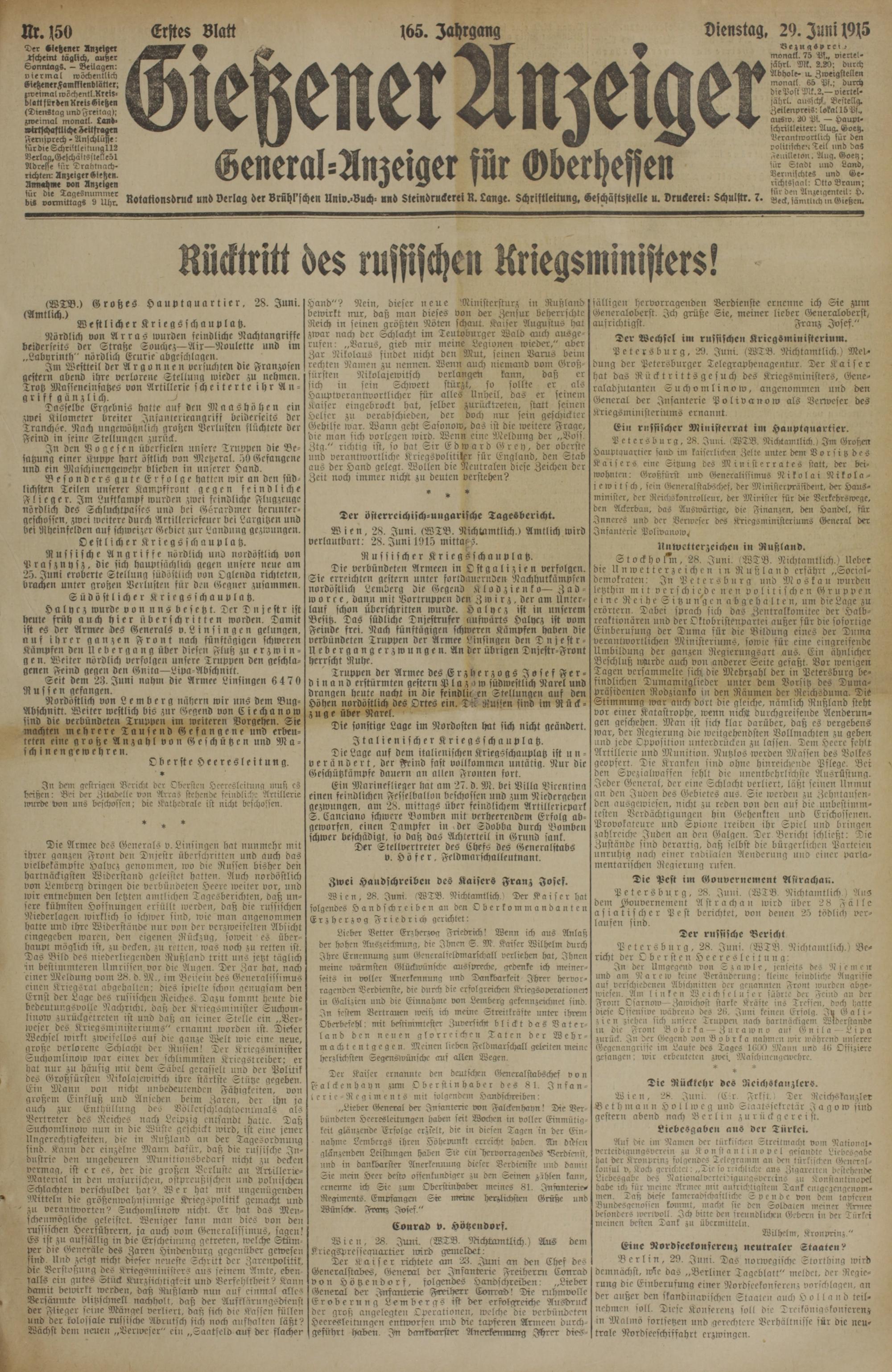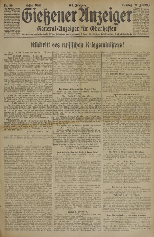 Die Armee des Generals v. Linsingen hat nunmehr mit ihrer ganzen Front den Dnmjestr überschritten und auch das vielbekämpfte Halycz genommen, wo die Russen bisher den hartnäckigsten Widerstand geleistet hatten. Auch nordöstlich von Lemberg dringen die verbündeten Heere weiter vor, und wir entnehmen den letzten amtlichen Tagesberichten, daß un— sere kühnsten Hoffnungen erfüllt werden, daß die russischen Niederlagen wirklich so schwer sind, wie man angenommen hatte und ihre Widerstände nur von der verzweifelten Absicht eingegeben waren, den eigenen Rückzug, soweit es über— haupt möglich ist, zu decken, zu retten, was noch zu retten ist. Das Bild des niederliegenden Rußland tritt uns jetzt täglich in bestimmteren Umrissen vor die Augen. Der Zar hat, nach einer Meldung vom 28. d. M., im Beisein des Generalissimus einen Kriegsrat abgehalten; dies spielte schon genugsam den Ernst der Lage des russischen Reiches. Dazu kommt heute die bedeutungsvolle Nachricht, daß der Kriegsminister Suchom⸗ linow zurückgetreten ist und daß an seiner Stelle ein„Ver weser des Kriegsministeriums“ ernannt worden ist. Dieser Wechsel wirkt zweifellos auf die ganze Welt wie eine neue,