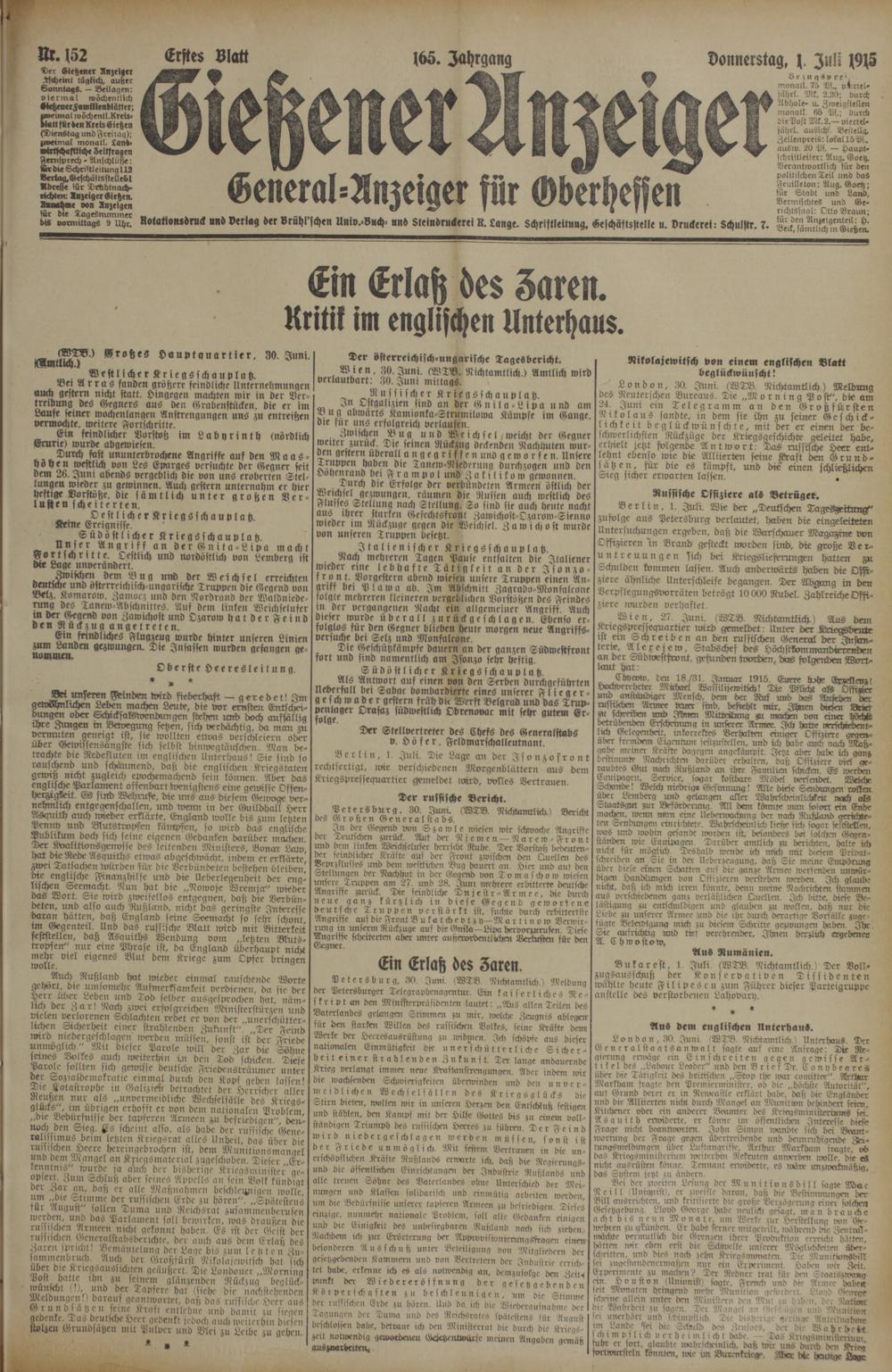 ZBezugspre monatl. 75 Pf., vbrtel⸗ jährl. Mk. 2.20; durch Abhole- u. Zweigstellen monatl. 65 Pf.; durch die Post Mk. 2.— viertel; jährl. aussch! Bestellg. Zeilenpreis: loral 15 Pf., ausw. 20 Pf.— Haupt- schristleiter: Aug. Goetz. Verantwortlich für den politischen 1 9 das Feuilleton: Aug. Goetz; für Stadt und Land, Vermischtes und Ge⸗ richtssaal: Otto Braun; für den Anzeigenteil: H. Beck, sämtlich in Gießen.