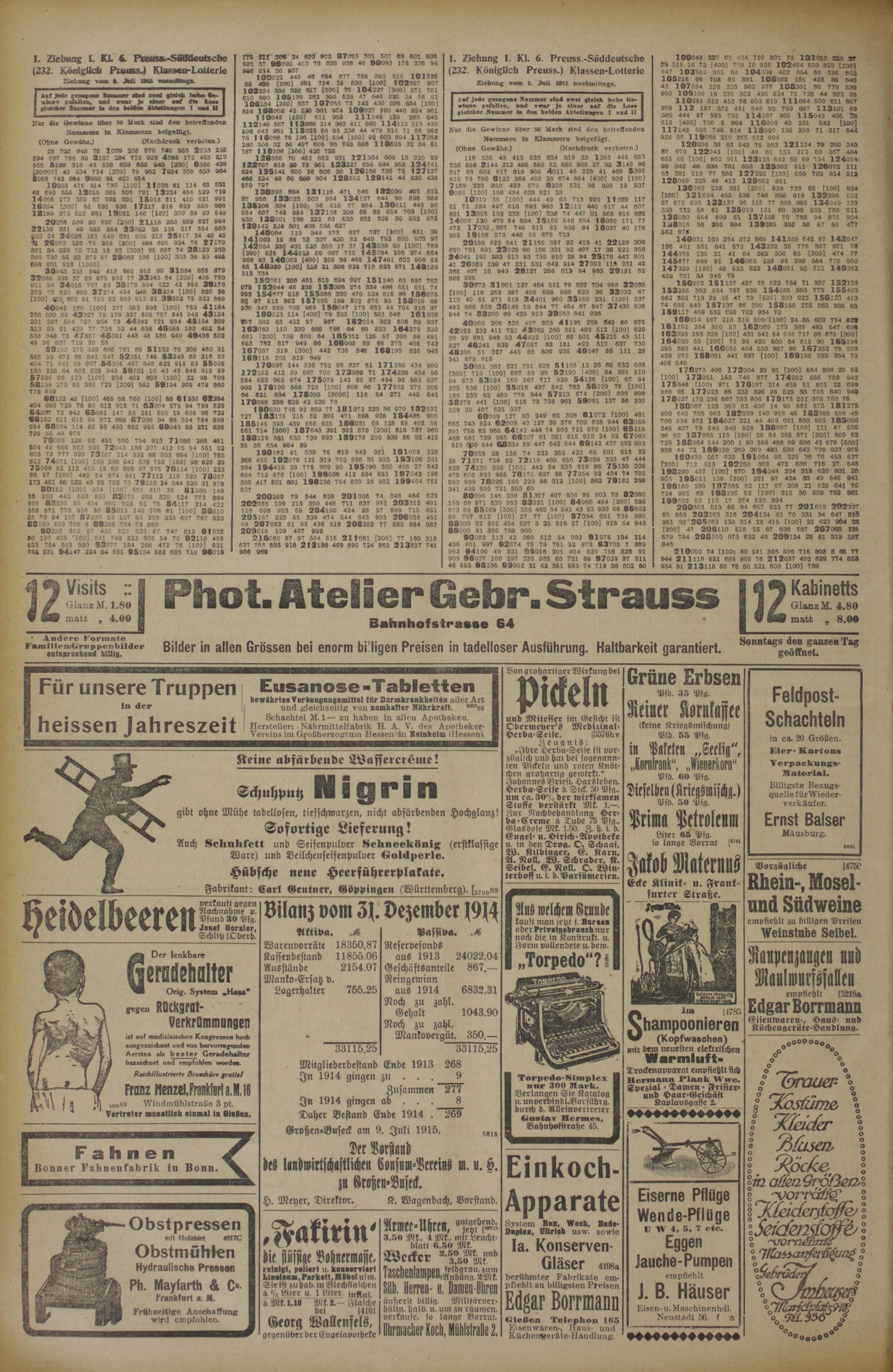 1. Ziehung 1. Kl. 6. Preuss.-Süddeutsche (232. Königlich Preuss.) Klassen-Lotterie Ziehung vom 9. Juli 1015 nachmittags.