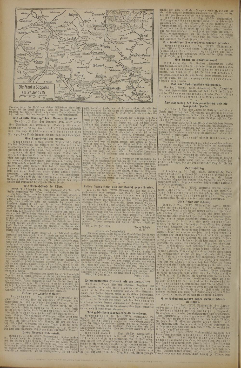 Gottes auf Rußlands bewaffnete Macht herab. 8 n* ee 1 5 93 5 8 8 5 N 17. i in, 1. Aug.(WTB. ich.) Gestern morgen Die Riesenschlacht im Osten. Kaiser Franz Josef und der Kampf gegen Italien. e. 5 17 e f en n Kristian ic, 31. Juli ichtamtlich) Der mil Wien, gl. Juli.(. Nichtamtlich) Mus dem Kriegs- 72 6 e N 2 i. 1 8. trische Mitarbeiter des„Morgenbladet“ schreibt⸗ pressegnartier wird gemeldet: Ter Kaiser hat nachstehendes 6 9er. Es gelang, gzeug