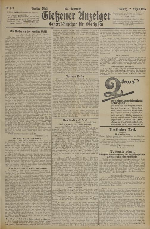 Gießen, 2. August 1915. Auf dem Felde der Ehre gefallen. (Aus Hessen und den Nachbargebieten.)