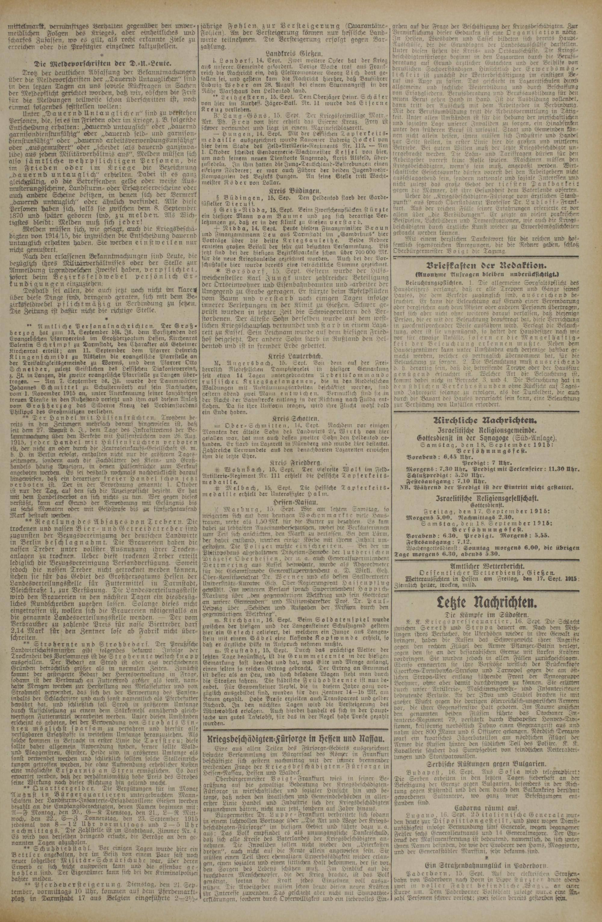 Amtlicher Wetterbericht. Oeffentlicher Wetterdienst, Gießen. Wetteraussichten in Hessen am Freitag, den 17. Sept. 1915