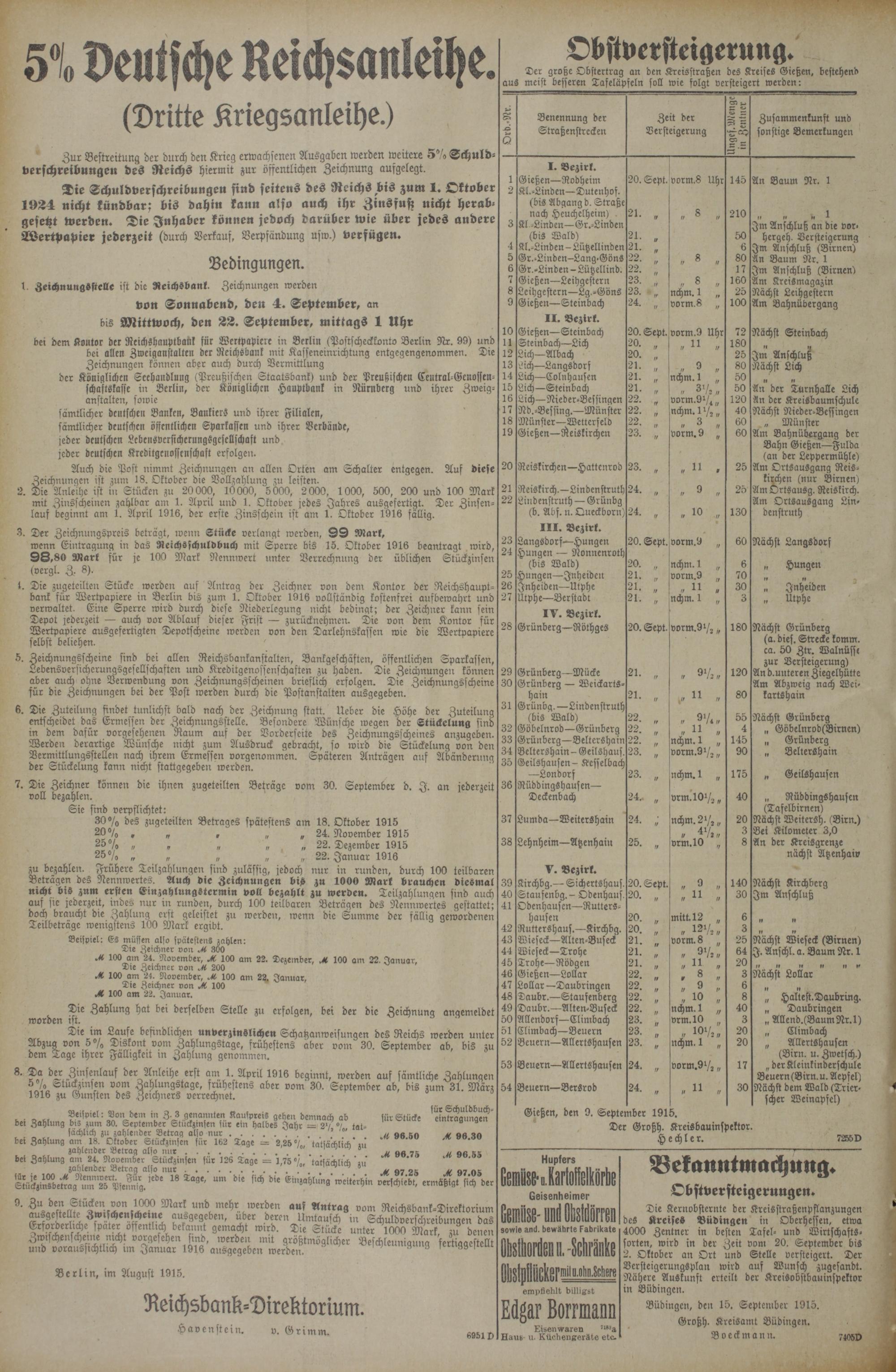 Gießen, den 9. September 1915. Der Großh. Kreisbauinspektor.