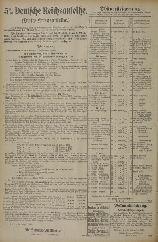 Bedingungen. 1. Zeichnungsstelle ist die Reichsbank. Zeichnungen werden von Sonnabend, den 4. September, an bis Mittwoch, den 22. September, mittags 1 Uhr