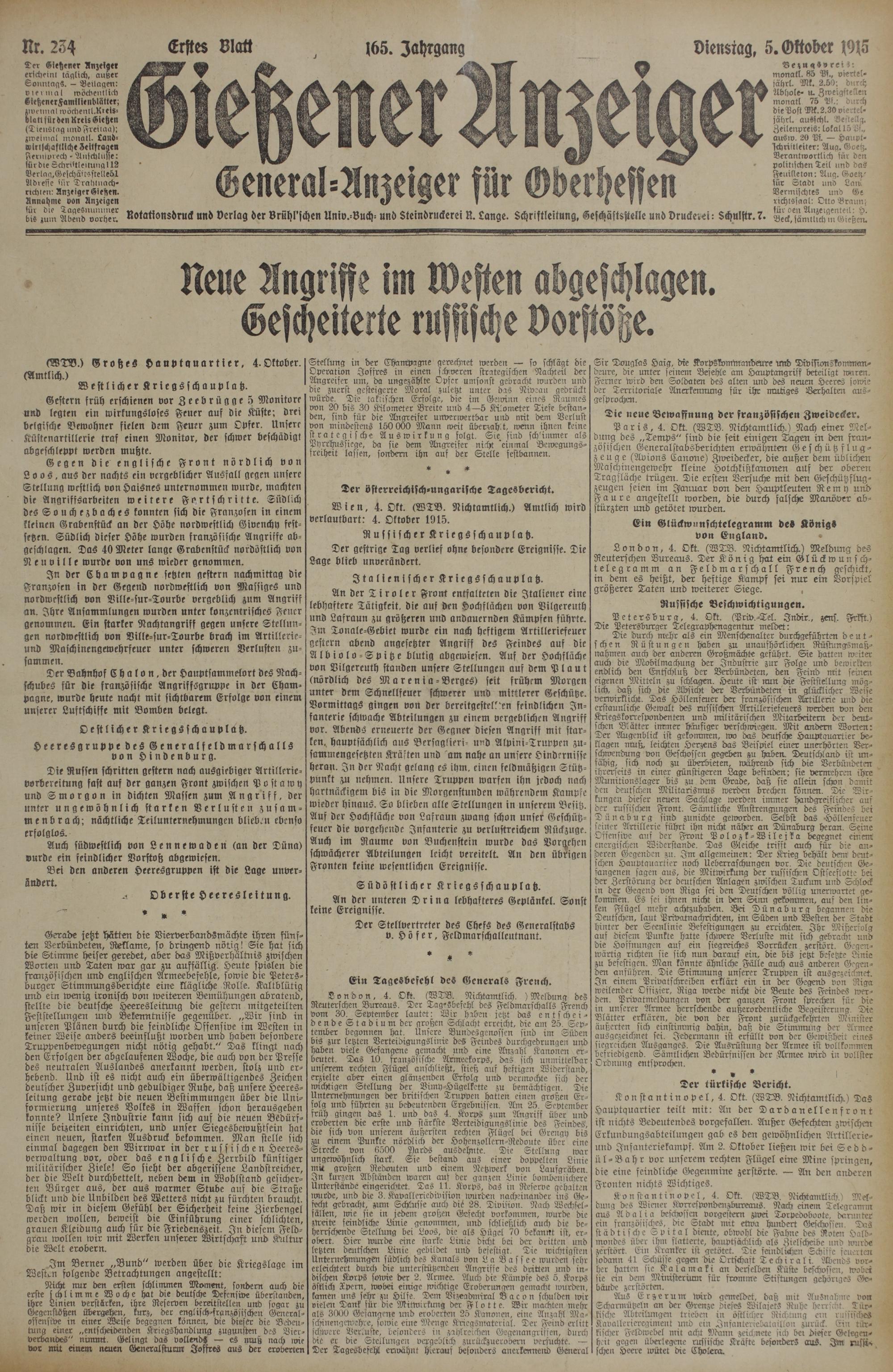 Bezu gayrei!: monatl. 85 Pf., viertel⸗ jährl. Mk. 2.50: durch Abhole- u. Zweigstellen monatl. 75 Pf.; durch die Post Mk. 2.30 viertel⸗ jährl. ausschl. Bestelle Zeilenpreis: lokal 15 B., ausw. 20 Pf.— Haupt- Ichriftleiter: Aug. Goetz. Verantwortlich für den politischen Teil und das Feuilleton: Aug. Goetz für Stadt und Lan Vermischtes und Ge richtssaal: Otto Braun; für den Anzeigenteil: H. Beck, sämtlich in Gießen.