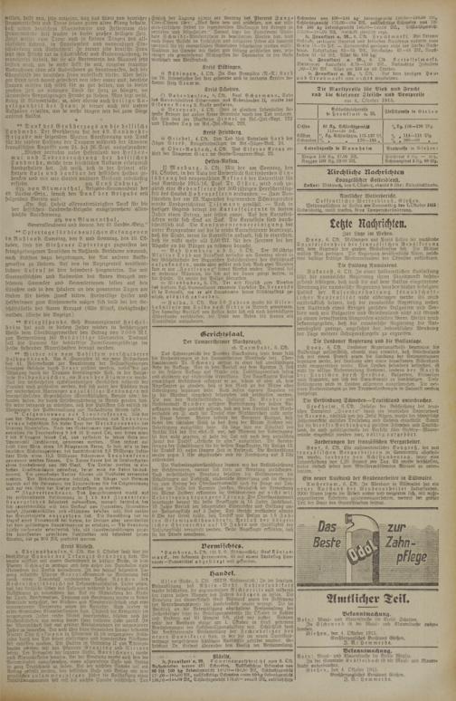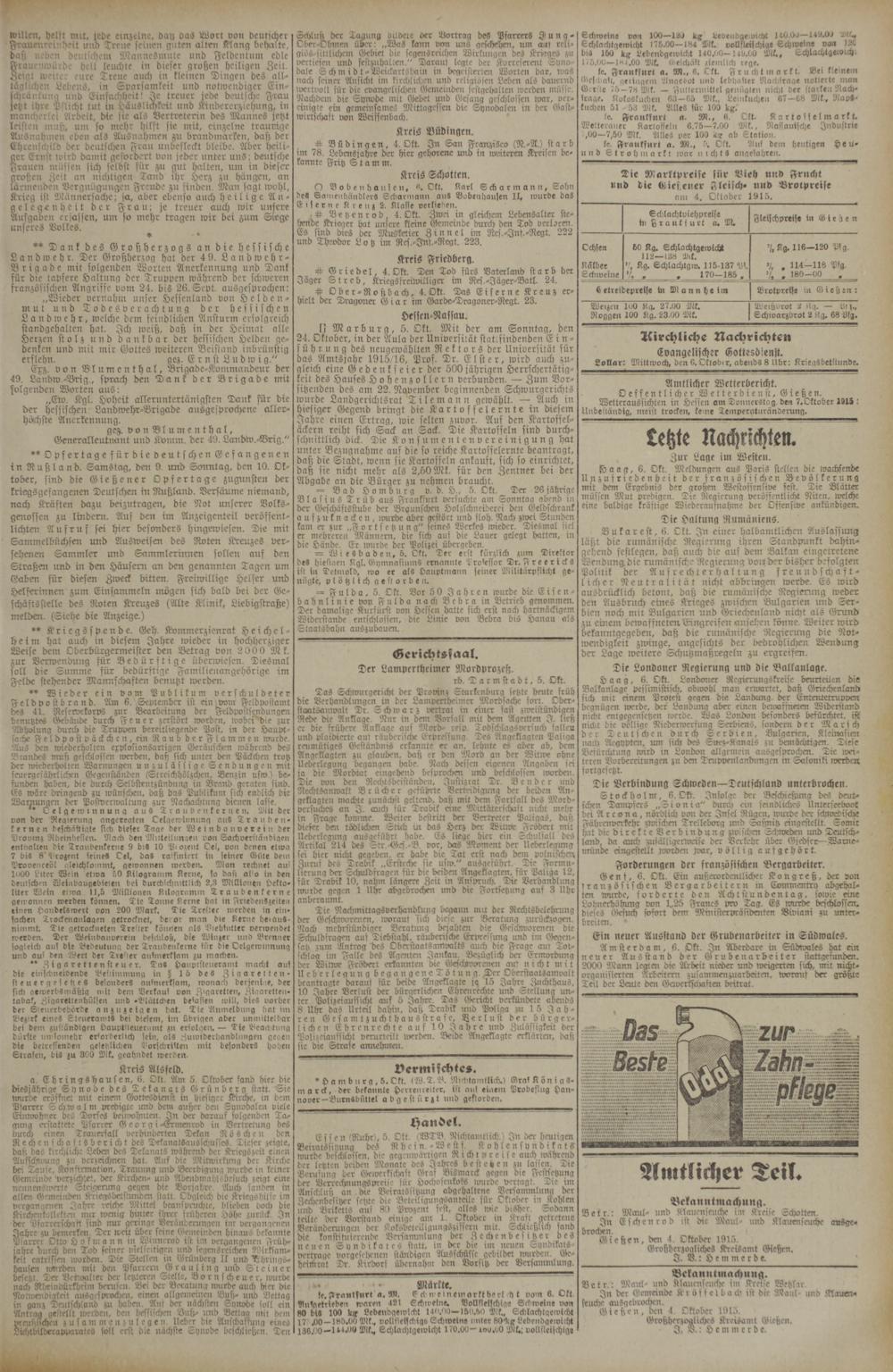 Amtlicher Wetterbericht. Oeffentlicher Wetterdienst, Gießen. Wetteraussichten in Hessen am Donnerstag, den 7. Oktober 1915 Unbeständig, meist trocken, keine Temperaturänderung. 2— 3——