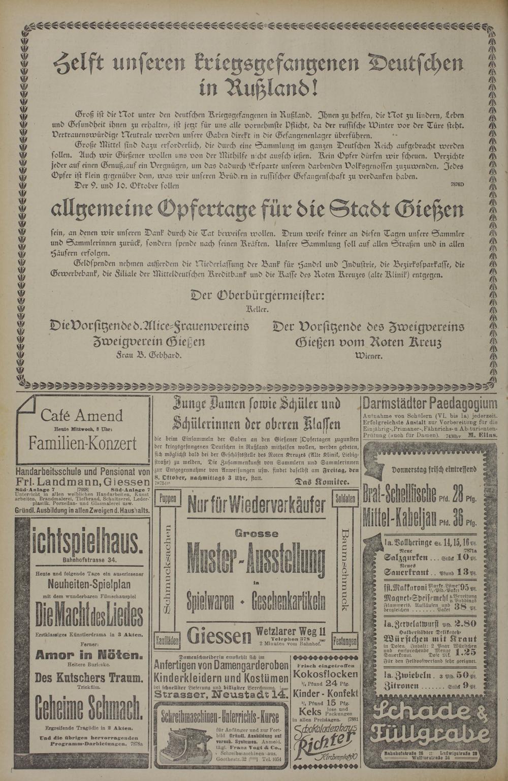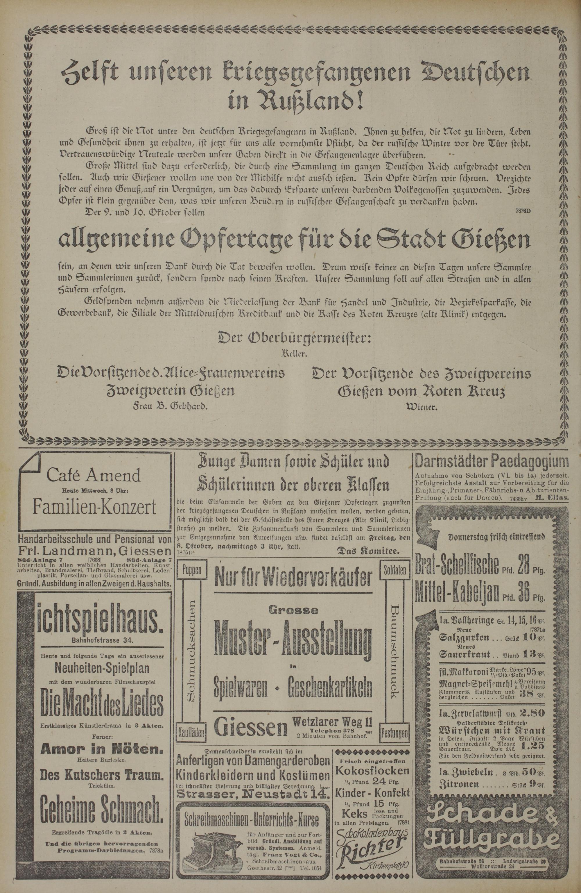 ö 5 gZelft unseren eie e 0 9 0 9 in Rußland! 3 1 2 0 1 Groß ist die Not unter den deutschen Kriegsgefangenen in Rußland. Ihnen zu helfen, die Not zu lindern, Leben f 4 5 und Gesundheit ihnen zu erhalten, ist jetzt für uns alle vornehmste Pflicht, da der russische Winter vor der Türe steht. N 5 Vertrauenswürdige Neutrale werden unsere Gaben direkt in die Gefangenenlager überführen. 5 50 7 Große Mittel sind dazu erforderlich, die durch eine Sammlung im ganzen Deutschen Reich aufgebracht werden 4 f J sollen. Auch wir Gießener wollen uns von der Mithilfe nicht aussch ießen. Kein Opfer dürfen wir scheuen. Verzichte W 8 jeder auf einen Genuß, auf ein Vergnügen, um das dadurch Ersparte unseren darbenden Volksgenossen zuzuwenden. Jedes 4 4 N Opfer ist klein gegenüber dem, was wir unseren Brüdern in russischer Gefangenschaft zu verdanken haben. N f J Der 9. und Jo. Oktober sollen 9 N 95 5 N70* 79 7 7 N allgemeine Opfertage für die Stadt Gießen * 2 7 f N * sein, an denen wir unseren Dank durch die Tat beweisen wollen. Drum weise keiner an diesen Tagen unsere Sammler 0 9 und Sammlerinnen zurück, sondern spende nach seinen Kräften. Unsere Sammlung soll auf allen Straßen und in allen 70 7 Häusern erfolgen. N * Geldspenden nehmen außerdem die N siederlassung der Bank für Handel und Industrie, die Bezirkssparkasse, die 1 85 Gewerbebank, die Filiale der Mitteldeutschen Kreditbank und die Kasse des Roten Kreuzes(alte Klinik) entgegen. 0 a 7„ f 8 9 Der OGberbürgermeister: 10 7 Keller. 8 1 1 g s f 10 7 Die vorsitended. Alice⸗Frauenvereins Der Vorsitzende des Zweigvereins 0 87 Zweigverein Gießen Gießen vom Roten Kreuz 550 * Frau B. Gebhard. Wiener. g 8 a 5 —..!! ̃ ͤ:.:. ̃ ͤ... ͤ