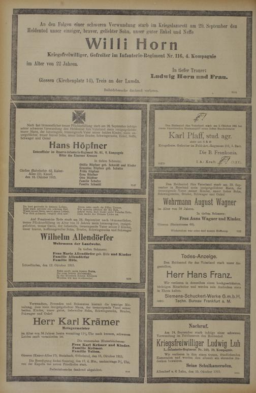 Nach fast 14 monatlicher treuer Pflichterfüllung starb am 26. September infolge seiner schweren Verwundung den Heldentod fürs Vaterland mein innigstgeliebter teurer Mann, der herzensgute, treusorgende Vater seiner beiden Kinder, mein un- vergeßlicher, treuer braver Sohn, unser lieber Bruder, Schwiegersohn, Enlcel, Neffe, Schwager und Onkel