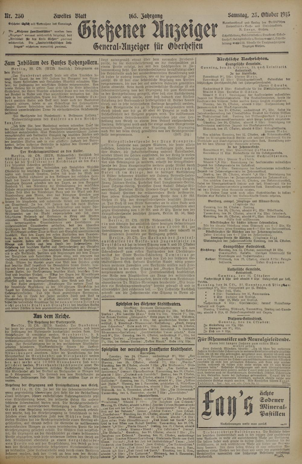 Sonntag, den 24. Oktober, 21. nach Trinitatis. Gottesdienst. In der Stadtfirche. Vormittags 9½ Uhr: Pfarrer Mahr. Vormittags 11 Uhr: Militärgottesdienst. Gedentfeier der 500 jährigen Herrschertätigkeit des Hohenzollernhauses. Pfarrer Schwabe.