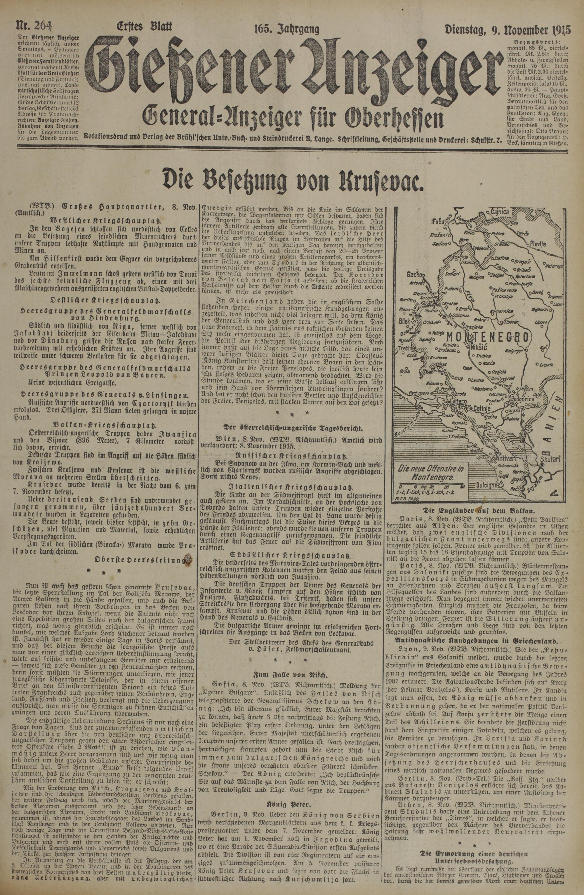 Berlin, 9. Nov. Ueber den König von Serbien wird verschiedenen Morgenblättern aus dem k. k. Kriegs⸗ pressequartier unter dem 7. November gemeldet: König Peter hat am 1. November noch in Jagodina geweilt, wo er eine Parade der Schumadia⸗Division ersten Aufgebots abhielt. Die Division ist von vier Regimentern auf ein ein⸗ ziges zusammengeschmolzen. Am 5. November passierte