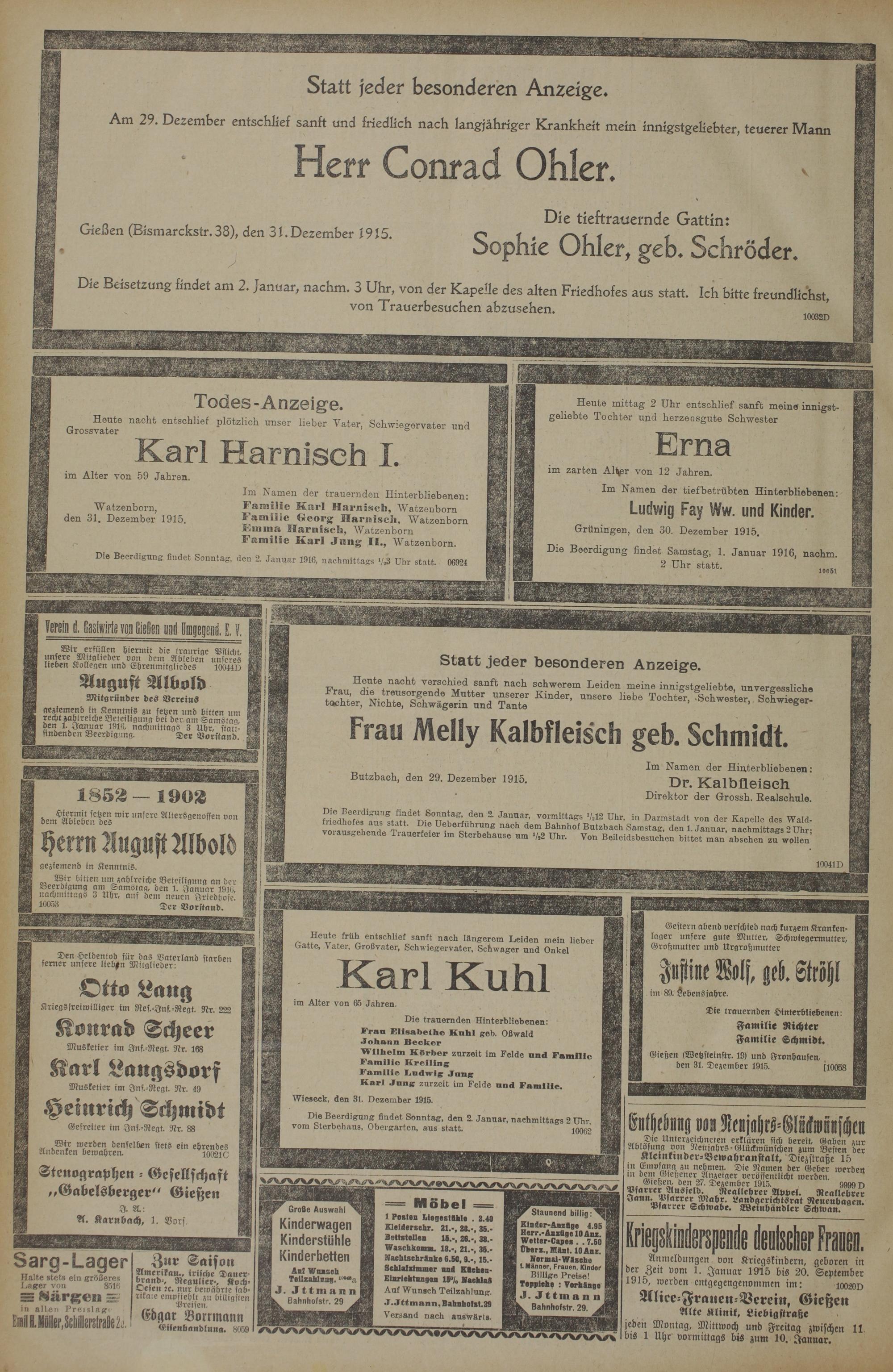 Die Beerdigung findet Sonntag, den 2. Januar 1916, nachmittags ½ Uhr statt. 06924 2 Uhr statt.