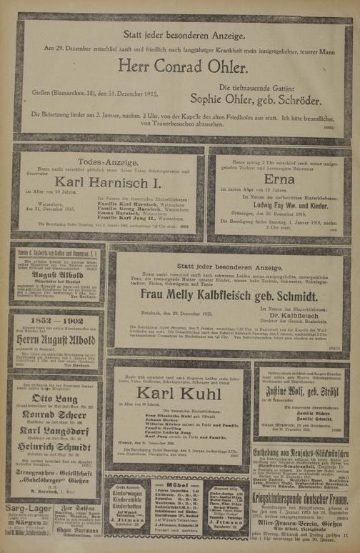 Die tieftrauernde Gattin: Gießen(Bismarckstr. 38), den 31. Dezember 1915. Sophie Ohler geb Schrꝭ der * 7 75„