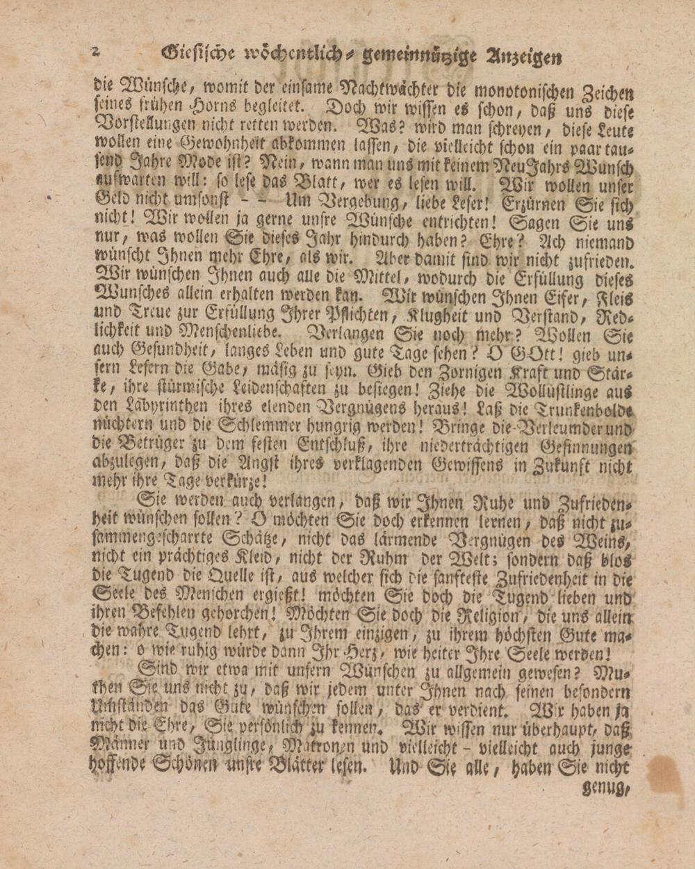 die Wünsche, womit der einsame Nachtwächter die monotonischen Zeichen ftn'es frühen Horns begleitet. Doch wir wissen es schon, daß uns diese Vorstellungen nicht retten werden. Was? wird man schreyen, diese Leute wollen eine Gewohnheit abkommen lassen, die vielleicht schon ein paar tau- stnd Jahre Mode ist? Nein, wann man uns mit keinem NeuJahrs Wunsch «ufwarten will: so lese das Blatt, wer es lesen will. Wir wollen unser Geld nicht umsonst - - Um Vergebung, liebe Leser! Erzürnen Sie sich nicht! W-r wollen ja gerne unsre Wünsche entrichten! Sagen Sie uns nur, was wollen Sie dieses Jahr hindurch haben? Ehre? Ach niemand wünscht Ihnen mehr Ehre, als wir. Aber damit sind wir nicht zufrieden. Wir wünschen Ihnen auch alle die Mittel, wodurch die Erfüllung dieses Wunsches allein erhalten werden kan. Wir wünschen Ihnen Eifer, FleiS und Treue zur Ettüllung Ihrer Pflichten, Klugheit und Verstand, Redlichkeit und Menschenliebe. Verlangen Sie noch mehr? Wollen Sie auch Gesundheit, langes Leben und gute Tage sehen? O GOtt! gieb uns lern Lesern die Gabe, mäfig zu sipn. Gieb den Zornigen Kraft und Stärke, ihre stürmische Leidenschaften zu besiegen! Ziehe die Wollüstlinge aus den Labyrinthen ihres elenden Vergnügens heraus! Laß die Trunkenbolde nüchtern und die Schlemmer hungrig werden! Bringe die-Verkeumderund die Betrüger zu dem festen Entschluß, ihre niederträchtigen Gesinnungen abzulegen, daß die Angst ihres verklagenden Gewissens in Zukunft nicht mehr ihre Tage verkürze!