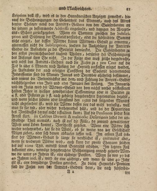 ftription voll ist, wird es in den Hannöverischen Anzeigen gemeldet, hierauf die Bescheinigungen der Gesundheit pes Mannes, auch des Alter« beyder Eheleute nebst den Antritts« Geldern von den Subskribenten an die sodann zu bestimmende Addreffe eingesandk, und dagegen der Äecepti« onS-Schein zurückgegcben. Wenn ein Ehemann zwischen der Subfcri. ption und Erüfnung der Societätverstirbet, oder die subsmbirte Summ« nicht erleget, hat dessen Wiktwe keinen Wilkwen« Gehalt zu erwarten, auermassen nicht die Subicripiion, sondern die Auszahlung der Antritts, Gelder die Aufnahme zu der Societät bewürcket. Die Subscribenten zu den ersten zwennahlhundert tausend Thalern, bedürfen der Bescheinigung des Anfangs threr Ehe nicht. In der Folge aber muß solche beygebracht, und nebst den Antritts«Geldern auch die Zinsen zu $ pro Cent auf di« ->eif so über 6 Monate nach Anfang der Heyrakh verflossen erleget werden. Zu Aufnahme der nach erfolgter Consistentz der Societät beytrettenden Interessenten sind die Monate JuniuS und December alscihrlich bestimmet, und nimmt die Verbindlichkeit mit dem, nach Zahlung der Ankriks - Gelder nächstfolgenden -k-n Julii und iten Januarii den Anfang. Im Januario und im Julio wird der Witwen«Gehalt von dem nächst vorher verflossenen halben Jahre in hiesiger gewöhnlichen Cassenmünje oder in Ducaten zu 4 n. oder Pistolen zu 7 fl. nach gehörig beygebrachter Legitimation bezahlt, und wenn solcher sodann oder längstens den i$t<n des folgenden Monats nicht abgefordert ist, wird die Witwe dessen vor das mahl verlustig, weil man sie für rod, oder wieder verheyrakhet hält, und bei der Repartition des Vorschusses darauf nicht reflectiren kann; Auf die Penfiones findet kein Arrest statt. In Cafibus Divortii & maliriofae IDefertionis leidet der UN« schuldige Theil niemals, auch ist aus die Fälle, da semand gewaltsamer Weist ums Leben kommt, Vorschrifft gegeben. Wenn eine Witwe sich wieder verheyrakhet, Hal sie die Wahl, ob sic weiter von »er Gesellschafk Nüzen ziehen, oder sich davon abkaufen lassen will. Im erstern Fall ces. siret der Witwen-Gehalt so lange sie verehlichet ist, conkinuiret aber, wenn sie wiederum Witwe wird, auch kann der zweite Ehemann solchen bis auf 1000 Thlr. mittelst seines Bevkritts erhöhen. Im letztern Fall bekommt eine, vermöge beygebrachter Bescheinigung annoch gesunde Witt« we di« unter 30 Jahren ist, eine sjährige Pension. Wenn sie von ;o biä 4° Jahren incl. ist, wird ihr eine 4jährige, und wenn sie über 40 Jahr alt ist, eine dreysälmge Pension gereichet. Zu diesen Heyrakhs.Premien sind die Zinsen von V«I Antritts «Geldern derer, die nach subsmbir«