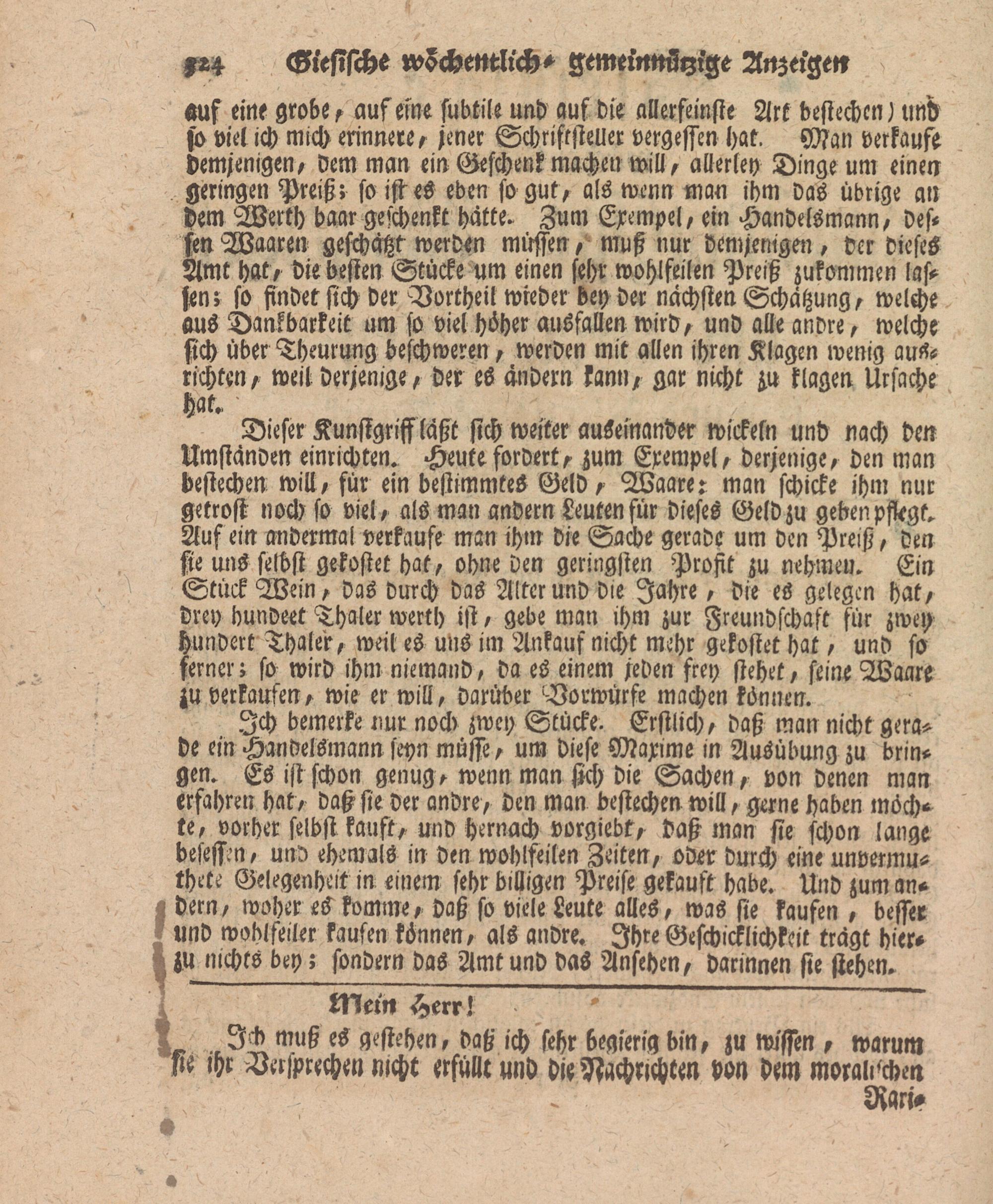 Ich bemerke nur noch zwey Stücke. Erstlich, daß man nickt gerade ein Handelsmann seyn müsse, um diese Maxime in Ausübung zu bringen. Es ist schon genug, wenn man sich die Sachen, von denen man erfahren hat, daß sie der andre, den man bestechen will, gerne haben möchte, vorher selbst kaust, und hernach vorgiebt, daß man sie schon lange besessen, und ehemals in Den wohlfeilen Zeiten, oder durch eine unvermu- thete Gelegenheit in einem sehr billigen Preise gekauft habe. Und zum andern, woher es komme, daß so viele Leute alles, was sie kaufen , besser und wohlfeiler kaufen können, als andre. Ihre Geschicklichkeit trägt hier- zu nichts bey; sondern das Amt und das Ansehen, darinnen sie stehen.