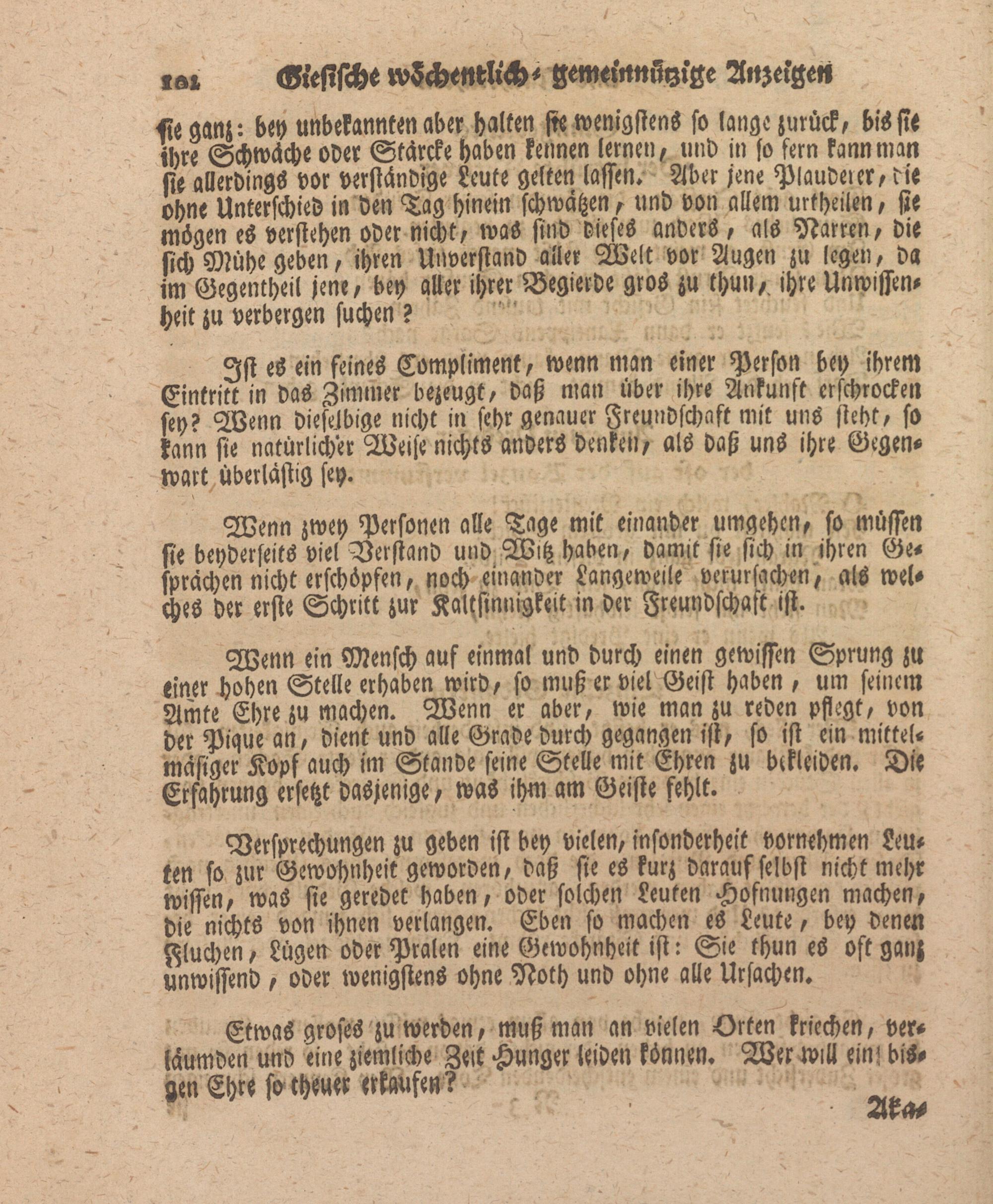 «e aanr: bey unbekannten aber halten fie wenigstens so lange zurück, bis sie ihre Schwäche oder Stärcke haben kennen lernen, und in so fern kann man sie allerdings vor verständige Leute gelten lassen» Aber jene Plauderer, die ohne Unterschied in den Tag hinein schwatzen, und von allem urfheilen, sie mögen es verstehen oder nicht, was sind dieses anders, als Narren, die sich Mühe geben, ihren Unverstand aller Welt vor Augen zu legen, da im Gegentheil jene, bey aller ihrer Begierde gros zu thun,. ihre Unwissenheit zu verbergen suchen ?