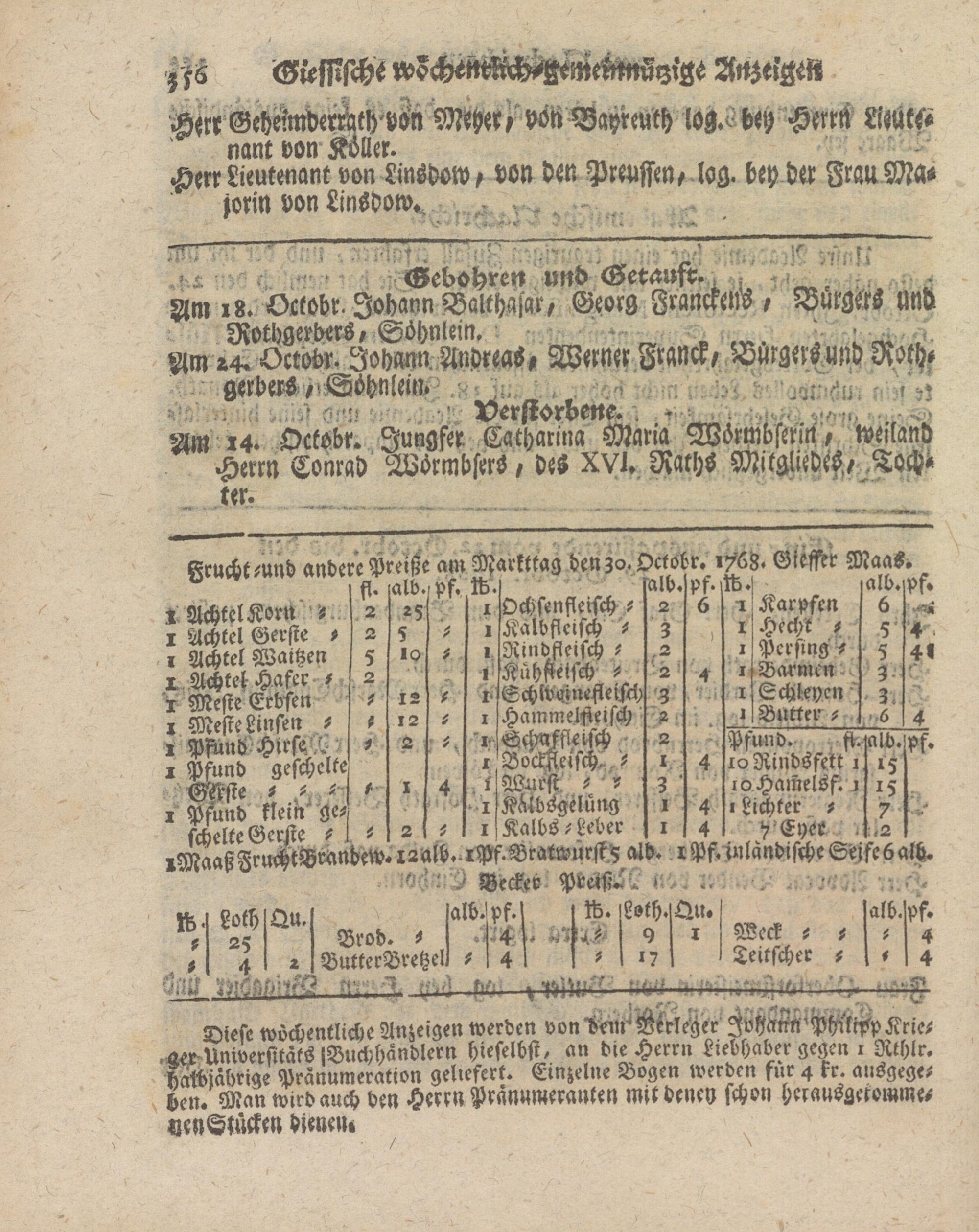 Keucht-und andere Preiße am Markttag den zo. Octobr. 1768. Grelftr Maas. u fi. alb.,pf. Id. salb. Pf. w.! alb.l