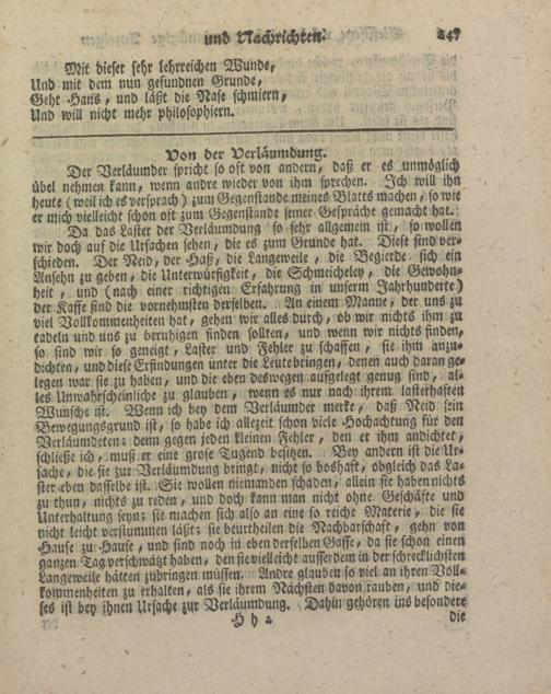 Der Verläumder spricht so oft von andern, daß er es unmögllch übel nehmen kann, wenn andre wieder von ihm sprechen. Ich will ihn heute (weil ich es versprach) zum Gegenstände meines Blatts machen, so wie er mich vielleicht schon oft zum Gegenstände semer Gespräche gemacht hak.
