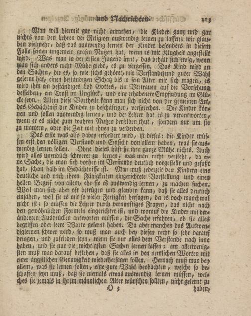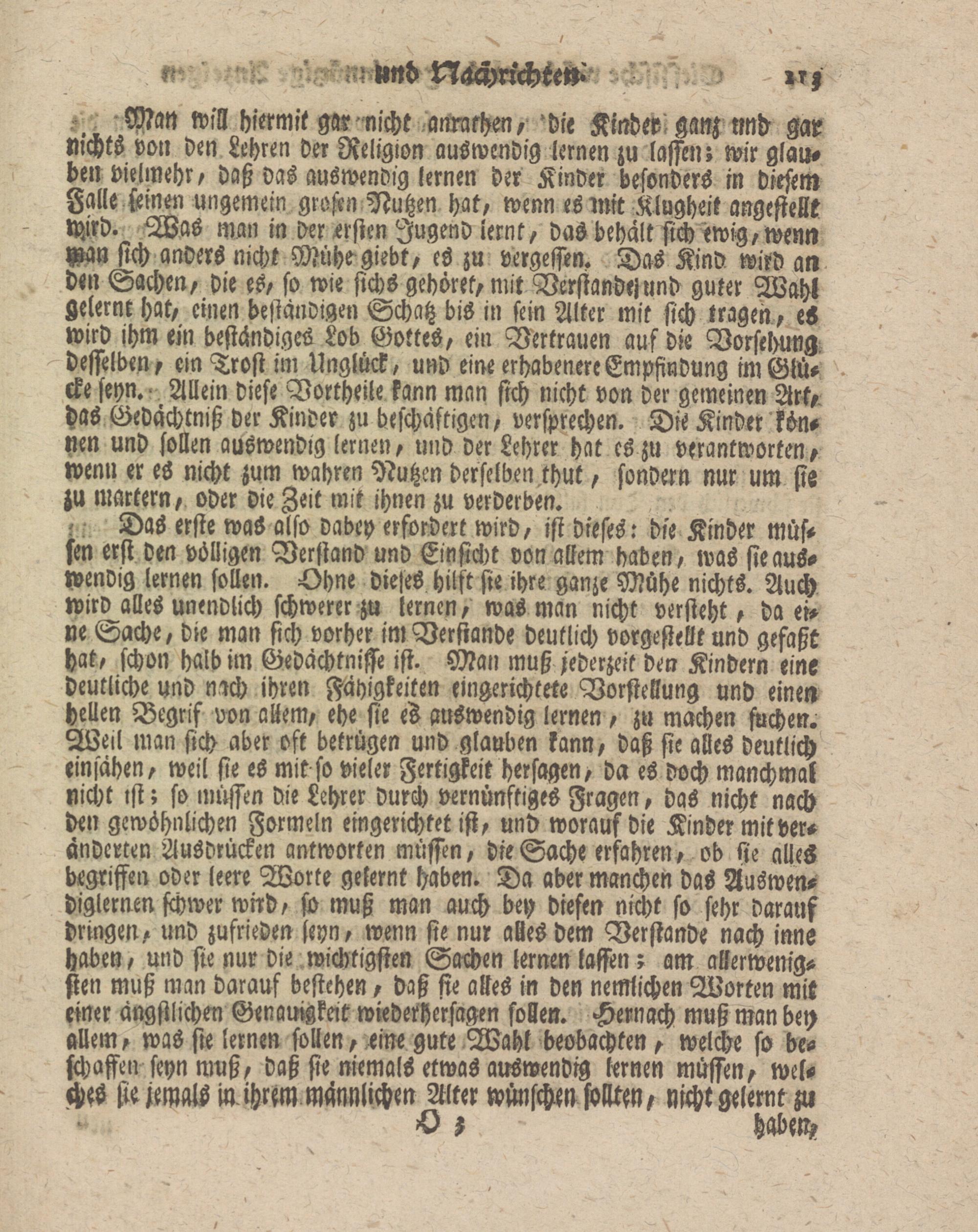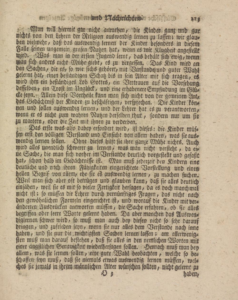Mn will hiermit gar nicht anrachen, 'die Kinder ganz tmb gar mchts von den Lehren der Religion auswendig lernen zu lassen; wir glauben vielmehr, daß das auswendig kernen der Kinder besonders in diesem Falle seinen ungemein groftn Nutzen hat, wenn es mit Klugheit angestellt Hird. Was man in der ersten Jugend lernt, das behalt sich ewig, wenn Wan sich anders nicht Mühegiebt, es zu vergessen. Das Kind wird an den Sachen, die es, so wie sichs gehöret, mit Verstandst und guter Wahl gelernt hat, einen beständigen Schatz bis in sein Alter mit sich tragen, eS wird ihm ein beständiges Lob Gottes, ein Vertrauen auf die Vorsehung desselben, ein Trost im Unglück, und eine erhabenere Empfindung im Glücke seyn. Allein diese Vortheile kann man sich nicht von der gemeinen Art,, das Gedachtniß der Kinder zu beschäftigen, versprechen. Die Kinder können und sollen auswendig lernen, und der Lehrer hat es zu verantworten, wenn er es nicht zum wahren Nutzen derselben thut, sondern nur um sie zu martern, oder die Zeit mit ihnen zu verderben.