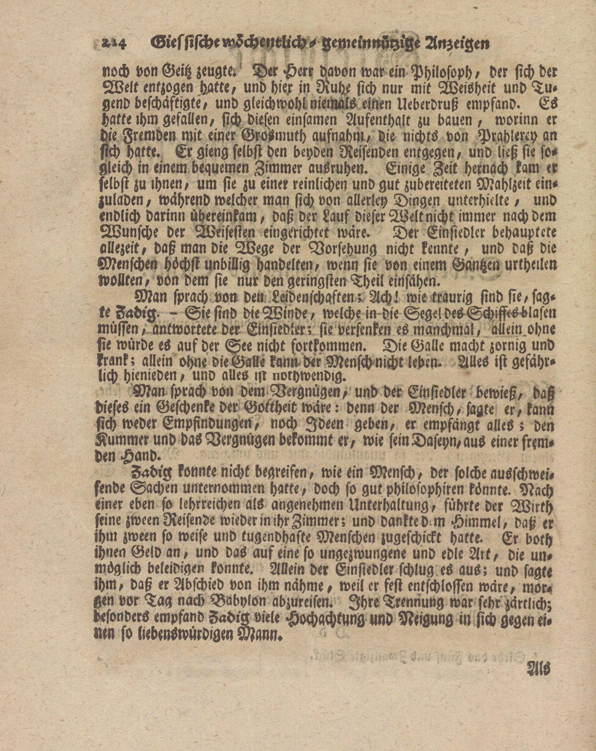 Zadr'g konnte nicht begreifen, wie ein Mensch, der solche ausschweifende Sachen unternommen hatte, doch so gut philosophiren könnte. Nach einer eben so lehrreichen als angenehmen Unterhaltung, führte der Wirth seine zween Reisende wieder in ihr Zimmer; und dankte d m Himmel, daß er ihm zween so weise und tugendhafte Menschen zugeschickt hatte. Er both ihnen Geld an, und das auf eine so ungezwungene und edle Art, die unmöglich beleidigen konnte. Allein der Einsiedler schlug es aus; und sagte ihm, daß er Abschied von ihm nähme, weil er fest entschlossen wäre, morgen vor Tag nach Babylon abzureisen. Ihre Trennung war sehr zärtlrch; besonders empfand Zadtz viele Hochachtung und Neigung in sich gegen einen so liebenswürdigen Mann.