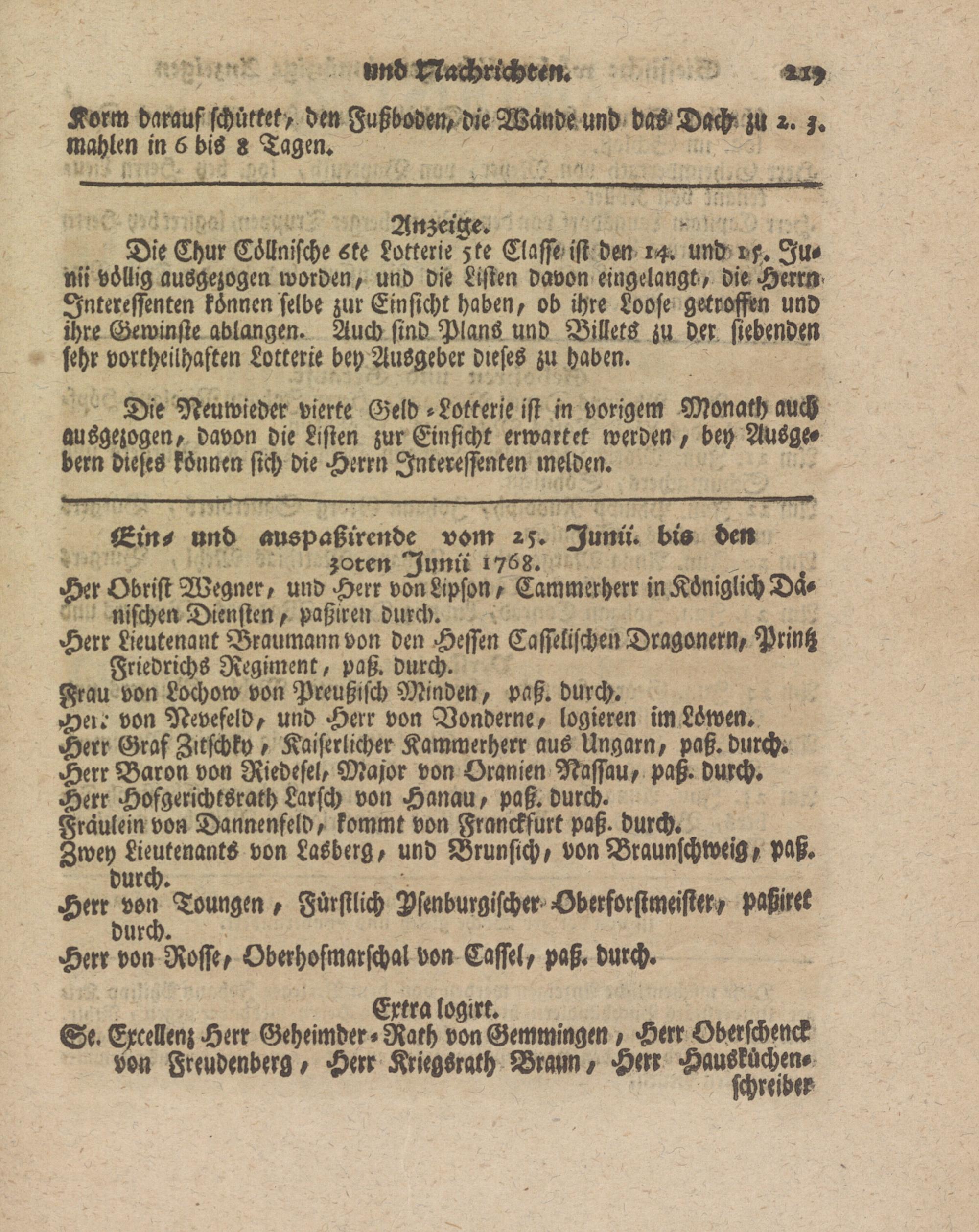 Her Obrist Wegner, und Herr von Lipson, Cammerherr in Königlich Dänischen Diensten, paßiren durch.