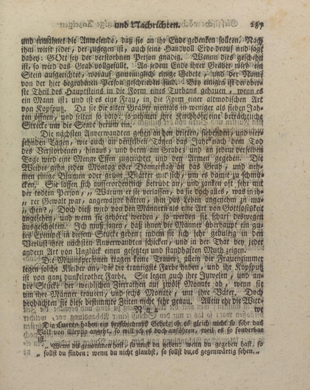 tMd üMWk die Anwesende, daß sie an ihr Ende gedenken solltön.--Näch ihm wirft jeder, der zugegen ist, auch seine Handvoll Erde VrckUf Nndssagk dabey: GOtt sey der verstorbnen Person gnädig. Wönnn Vies gescheht ist, so wird daS Grab voügefüllt. An jedem Ende ihrer GräM-wird eitt Stein aufgsrichtet, woräufgemeimglW einige Gebete