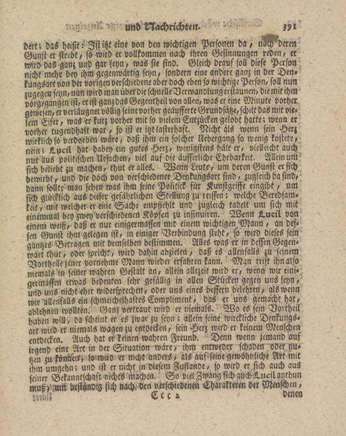 Serk; das heißt:' Ist itzt eine von den wichtigen Personen da, «Ederen Gunst er strebt, so wird er vollkommen nach ihren Gesinnungen reden, er wird das ganz und gar seyn, was sie sind. Gleich drauf soll diese Person nicht mehr bey ihm gegenwärtig seyn, sondern eine andere ganz in der Denkungsart von der vorigen verschiedene aber doch eben so wichtige Person, soll nun zugegenseyn,nun wird manüberdie schnelleVerwandlungerstaunen,diemikihm vörgegangen ist, er ist ganz das Gegentheil von allen, was er eine Minute vorher gewesen, er verlaugnet völlig seine vorher geäußerte Grundsätze,schilt das mit vielem Eifer, was er kurz vorher mit so meiern Entzücken gelobt hatte; wenn er vorher tugendhaft war, so ist er itzt lasterhaft. Nicht als wenn sein Herj wirklich so verdorben wäre, daß ihm ein solcher Uebergang so wenig kostete, nein; Lrrcrl hat dabey ein gutes Herz, wenigstens hält er, vielleicht auch nur aus politischen Ursachen, viel auf die äusserliche Ehrbarkeit. Alleinum sich beliebt zu machen, thut er alles. Wenn Leute , um deren Gunst er sich bewirbt, und die doch von verschiedener Denkungsart sind, zugleich da sind, - dann sollte man sehen was ihm seine Politick für Kunstgriffe eingibt, um sich glücklich aus dieser gefährlichen Stellung zu reissen; welche Beredsam- keit, mit welcher er eine Sache empfiehlt und zugleich tadelt um sich mit einemmal bey zwey verschiedenen Köpfen zu insinuiren. Wenn Lucü von einem weiß, daß er nur einigermassen mit einem wichtigen. Mann , an dessen Gunst ihm gelegen ist, in einiger Verbindung steht, so wird dieses sein aantzes Betragen mit demselben bestimmen. Alles was er in dessen Gegenwart thut, oder spricht , wird dahin abzielen, daß es allenfalls zu seinem Vortheile jener vornehme Mann wieder erfahren kann. Man trift ihn also niemals in seiner wahren Gestalt an, allein allezeit wird er, wenn wir eint* qermaffm etwas bedeuten sehr gefällig in allen Stücken gegen uns seyn, und uns nicht eher widersprechen, oder uns eines bessern belehren, als wenn wir allenfalls ein schmeichelhaftes Compliment,. das er uns gemacht hat, ablehnen wollten. Ganz vertraut wird er niemals. Wo es sein Vorkheil haben will, da scheint er es zwar zu seyn ; allein seine wirckliche Denkungsart wird er niemals wagen zu entdecken, sein Herz wird er keinem Menschen entdecken. Auch hat er keinen wahren Freund. 1 Denn wenn jemand auf irgend eine Art in der Situation wäre , ihm entweder schaden oder nu- fcen zu könnet so wird er nicht anders, als auf seine gewöhnliche Art mit ihm umgehn; und ist er nicht in diesem Zustande,, so wird er sich auch aus seiner Bekanntschaft nichts machen. So viel Zwang sich auchLucilanthun muß-beständig sich nach.- den verschiedenen Charakteren der Menschen,