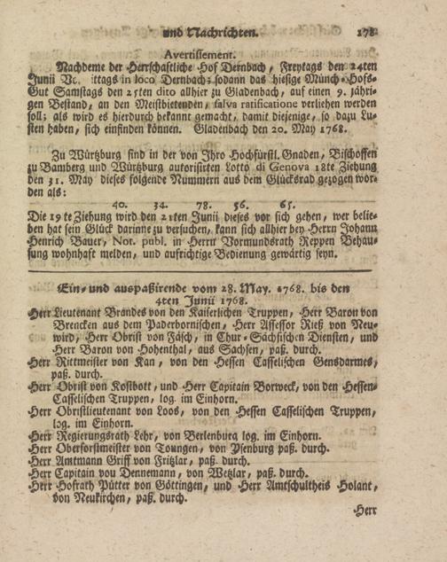 Zu Mürtzburg sind in der von Jhro Hochfürstl. Gnaden, Bischoffen zu Bamberg und Würtzburg autorisirten Lotto di CSenova i8te Ziehung den -r. May dieses folgende Nummern aus dem Glücksrad gezogen worr den alS: