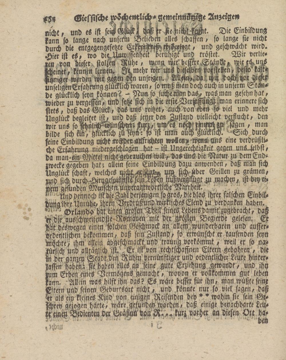 " Orlaftdo hat d'nen Uosen'Theil seines Le.bensdamit'zugebracht, daß HM'ausschwrifetidsti Romanen mit der MW Begierde gelesen. Er M deswegen einen solchen Geschmack an allem'wunderbaren und ausserordentlichen bekommen, daß sein Zustand, so erwünschter tausenden seyn Möchte, chm allein abgeschmackt und traurig vorkömmt, weil er so na* Mich und alltäglich jst//Er ist'von rechtschaffnen Eltern gebohren , die fn der'ganzen Stadtd'en Rühm vernünftiger und ordentlicher Leute hinterlassen habend Khaben älles an seine' gute Erziehung gewandt , und ihy ium Erben eines Vermögens gemacht, wovon er vollkommen gut leben kann. Allein was hilft ihn das? ES wäre besser für ihn, man wüßte sein, Eitern und seinen Geburtsort nicht, und könnte nur so viel sagen, daß §er als ein kleines Kind von einigest.preisenden beh * * wohin sie sein Gr- Wey gezogen hätte, wäre gefundch .Wochen, daß einige benachbarte Leü- ttNnest Bchimttn M Gräfinü von R.^ kurz vorher an diesen Ort ha-