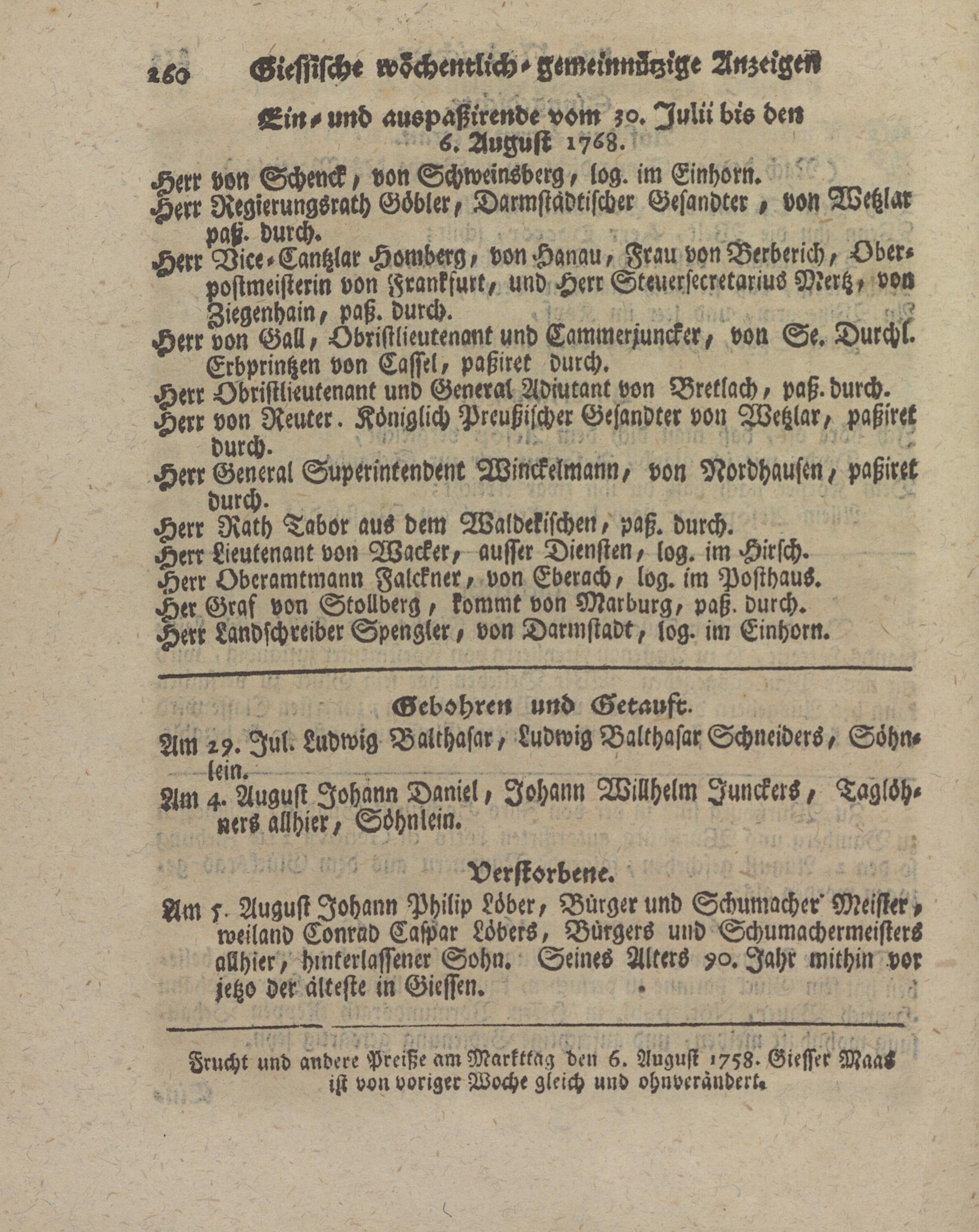 Frucht und andere Preiße am Markttag den 6. August >758-Giesser Mas ist von voriger Woche gleich und ohnveraudert«