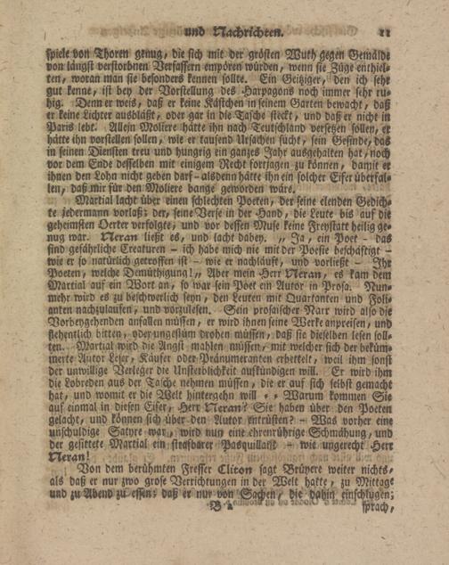 Martial lacht über einen schlechten Poeten, der seine elenden Gedichte jedermann vorlaß; der, feineVerse in der Hand, die Leute bis auf die geheimsten Oerter verfolgte, und vor dessen Muse keine Freystatt heilig genug war. Neran ließt es, und lacht dabey. „ Ja, ein Poet - daS find gefährliche Creakuren - ich habe mich nie mit der Poesie beschäftigt - wie er so natürlich getroffen ist - wie er nachläuft, und vorließt - Ihr Poeten, welche Demüthigunq!,, Aber mein Herr Neran, es kam dem Martial auf ein Work an, so war sein Poet em Autor in Prosa. Nunmehr wird es zu beschwerlich seyn, den Leuten mit Quartanten und Folianten nachzulaufen, und vorzulesen. Sein prosaischer Narr wird also die Vorbeygehenden anfallen müssen, er wird ihnen seine Werke anpreisen, und flehentlich bitten, oder ungestüm drohen müssen, daß sie dieselben lesen sollten. Martial wird die Angst mahlen müssen, mit welcher sich der bekümmerte Autor Leser, Käufer oder Pränumeranten erbettelt, weil ihm sonst der unwillige Verleger die Unsterblichkeit auskündigen will. Er wird ihm die Lobreden aus der Tasche nehmen müssen, die er auf sich selbst gemacht hat, und womit er die Welt hintergehn will * * Warum kommen Sie auf einmal in diesen Eifer, Herr Neran? Sie haben über den Poeten gelacht, und können sich über den Autor entrüsten? - Was vorher eine unschuldige Satyre war^, wird nun eine ehrenrührige Schmähung, und der gesittete Martial ein strafbarer PasquiüaM wie ungerecht Herr Neran!