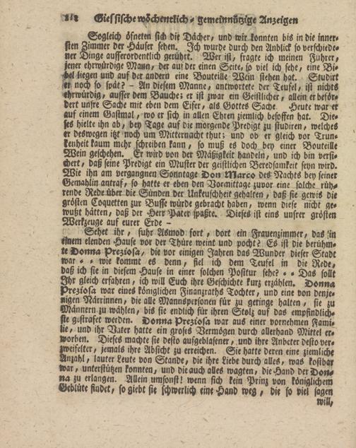 Sogleich üfneten sich die Dächer, und wir konnten bis in die inner# Pen Zimmer der Häuser sehen. Ich wurde durch den Anblick so verschiede, «er Dinge ausserordentlich gerührt. Wer ist/fragte ich meinen Führer, jener ehrwürdige Mann, der auf der einen Seite, viel ich sehe, eine Bibel liegen und auf der andern eine Bouteille Wein stehen hat. Studitt /rr noch so spat? - An diesem Manne, antwortete der Teufel, ist nichts ehrwürdig, ausserdem Bauche; er ist zwar ein Geistlicher, allein er befördert unsre Sache mit eben dem Eifer, als Gottes Same. Heute war er auf einem Gastmal, wo er sich in allen Ehren ziemlich besoffen hat. Dieses hielte ihn ab, bey Tage auf die morgende Predigt zu studiren, welches tr deswegen itzt noch um Mitternacht thut; und ob er gleich vor Trunkenheit kaum mehr schreiben kann, so muß es doch bey einer Bouteille Wein geschehen. Er wird von der Mäßigkeit handeln, und ich bin versichert , daß seine Predigt ein Muster der geistlichen Beredsamkeit seyn wird. Wie ihn am vergangnen Sonntage Don Marco des Nachts bey seiner Gemahlin antraf, so hatte er eben den Vormittage zuvor eine solche rüh, rende Redender die Sünden der Unkeuschheitgehalten, daß sie gewis die grösten Coquetten zur Buffe würde gebracht haben, wenn diese nicht gewußt hatten, daß der Herr Pater spaßte. Dieses ist eins unsrer grösten Werkzeuge auf eurer Erde -
