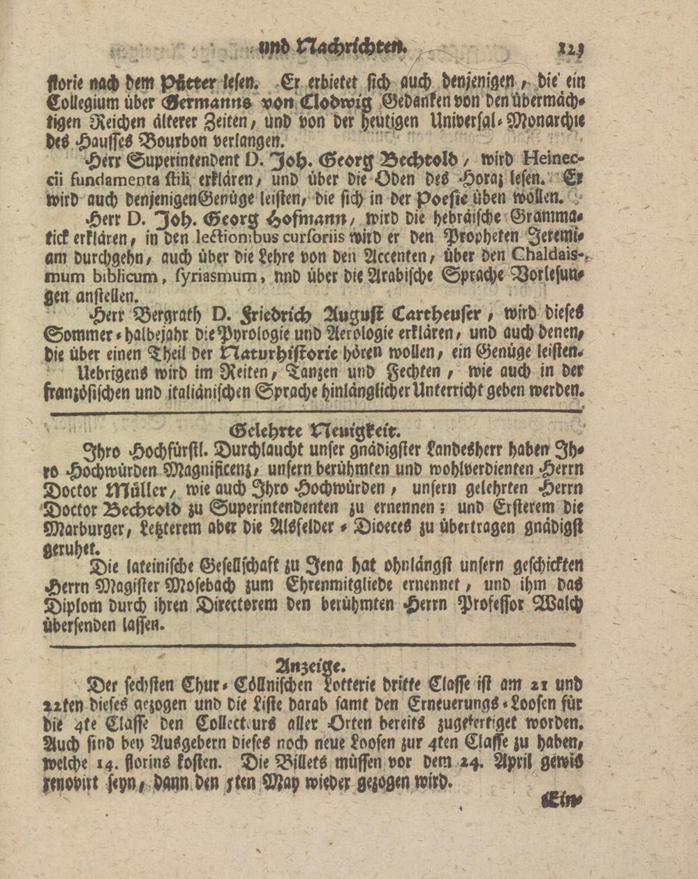 Ihrs Hochfürstl. Durchlaucht unser gnädigster Landesherr haben Ihrs Hochwürden Magnificenz, unfern berühmten und wohlverdienten Herrn Doctor Müller, wie auch Ihrs Hochwürden , unfern gelehrten Herrn Doctor Bechtold zu Superintendenten zu ernennen; und Ersterem die Marburger, Letzterem ab« die Alsfelder - DioeceS zu übertragen gnädigst geruhet.