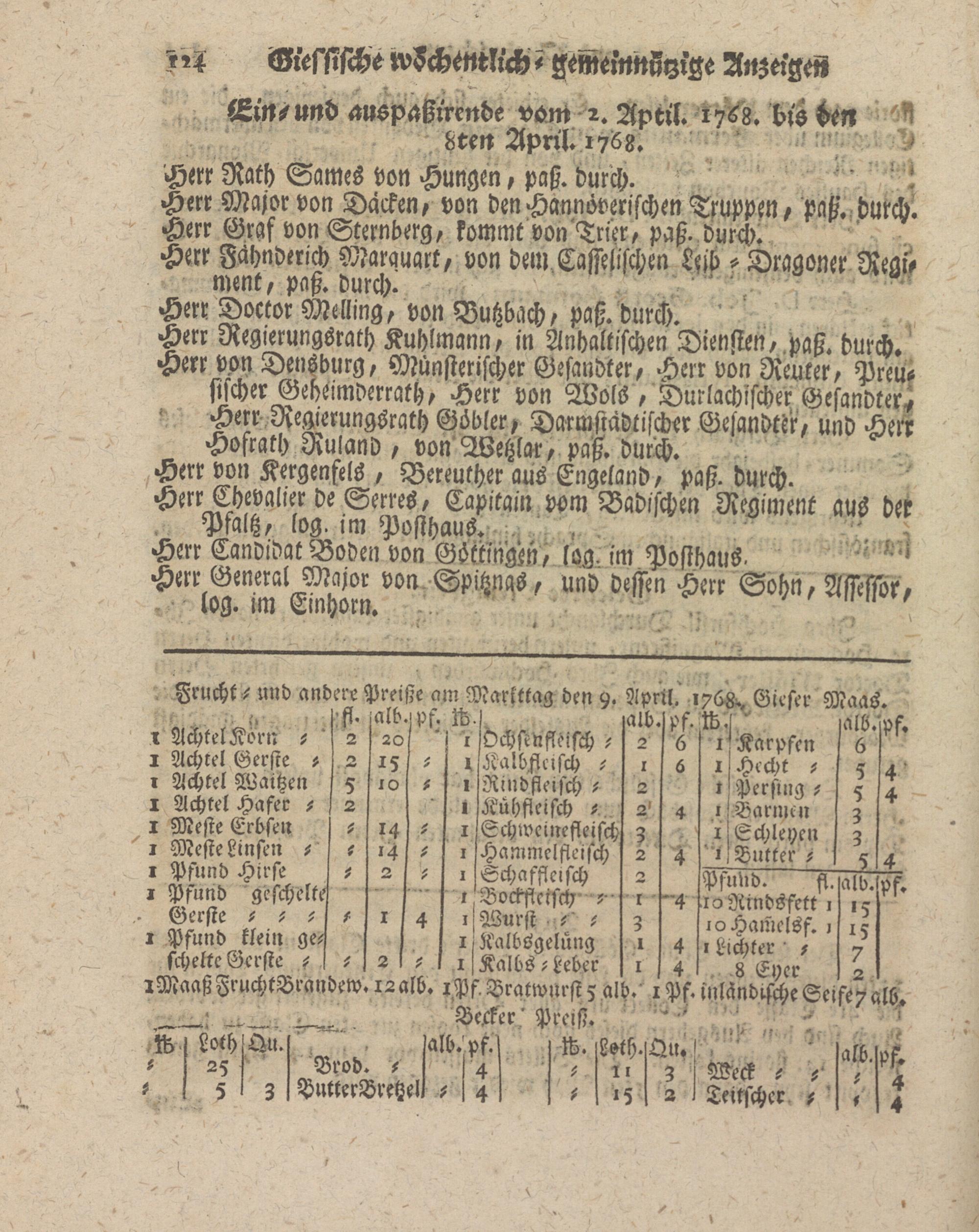 Frucht - und andere Preiße am Markttag den 9. April. 1768s Gieser Maas.