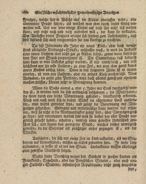 Da fast Jedermann alle Jahre ein neues Kleid, oder doch wenig» penS alltägliche KlcidungS-Stücke, anfchaffen muß, so wird die Ankunft einer neuen Uniform eben nicht gar zu kostbar fallen, zumal wenn dieselbige dem Amt und Stand proportiom'rt ist. Die Einwendung, daß dadurch viele Leute in neue Unkosten gesetzt werden, ist also unerheblich , und trist höchstens nur die erste Uniform, zu einer Zeit, wo man eben gerad keines neuen Kleides nöthig batte. Denn in den folgenden Zeiten ist es immer einerley, ob man eine Uniform, oder ein anders Kleid machen läßt. Neue Ausgaben, die unter zehn Personen, neun doch allemal gewiß und ohnedem machen müssen, können nicht in Betrachtung kommen.