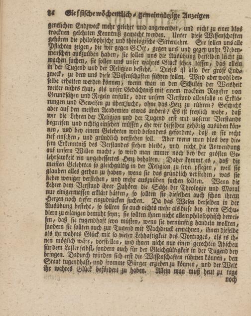 i«erden ksnnm, wenn man in den Schulen der Weisheit ™Q d un|ct Gedachkniß mit einem trocknen Register ron satzen und Regeln anfüllt, oder unfern Verstand allenfalls in Erklei- ®<w“i<rliu übenssucht, ohne das Herz zu rühren? Geschicht hi. eCu '"eisten Academieu etwas anders? Es ist freylich wahr, daß ♦wenöcr Religion und der Tugend erst mit unserm Verstände vegreyen und richtig einsehen müssen, ehe wir dieselben gehörig ausüben kön- nen, und bey einem Gelehrten wird besonders gefordert, daß er sse recht £ I* n' Hn£) Mündlich verstehen soll. Aber wenn man blos bei; die- Verstandes stehen bleibt, und nicht die Anwendung am unfern Willen macht, so wird man immer noch bey der grösten Ge- rT^"^^besserteS Herz behalten. Daher kommt es daß die meisten Gelehrten |o gleichgültig m der Religion zu seyn pflegen, weil sie glauben alles gethan zu haben, wenn sie das gründlich verstehen, was sie U o Trr ausjUüben suchen sollten. Wenn die Lehrer dem Verstand ihrer Zuhörer die Satze der Theologie und Moral nur einigermassen erklärt hatten, so sollten sie dieselben auch schon ihrem Herzen noch tiefer einzudrücken suchen. Da das Wesen derselben in der Ausübung besteht, so sollten sie auch nichts mehr als diese bey ihren Schu- dl-rn lu-rlangen bemüht seyn; sie sollten ihnen nicht allein philosophisch bewei- tugendhaft seyn müsten, wenn sie vernünftig handeln wollten, o^teu auch zur Tugend mit Nachdruck ermahnen, ihnen dieselbe als ihr^wahres Gluck mit io vieler Lebhaftigkeit des Vortrages, als es ihnen möglich wäre, vorstellen, und ihnen nicht nur einen gerechten Abscheu für dem Laster selbst, sondern auch für der Gleichgültigkeit in der Tugend bey n)UJt)/n *** erst die Wissenschaften rühmen können, den fromme Burger erziehen zu können, und der Welt rhr wahres Glück befördert zu haben. Allein man muß hem zu tage