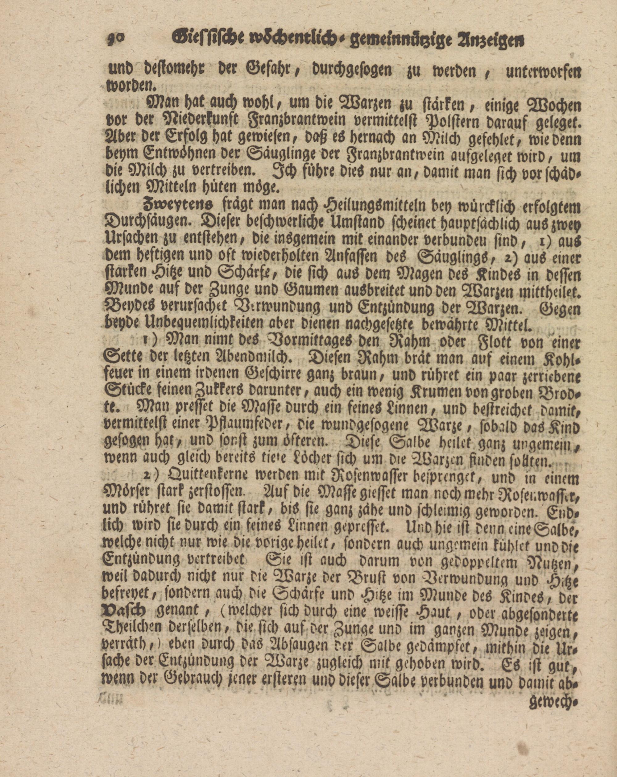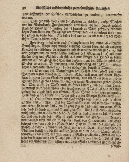 ।) Man nimt des Vormittages den Rahm oder Flott von einer Sette der letzten Abendmilch. Diesen Rahm brät man aus einem Kohlfeuer in einem irdenen Geschirre ganz braun, und rühret ein paar zerriebene Stücke seinen Zukkers darunter, auch ein wenig Krumen von groben Brod- tt. Man presset die Masse durch ein feines Linnen, und bestreichet damit, vermittelst einer Pfiaumfeder, die wundgesogene Warze, sobald das Kind gesogen hak, und sonst zum öfteren. Diese Salbe hellet ganz ungemein, wenn auch gleich bereits tie'e Löcher sich um die Warzen finden sollten.