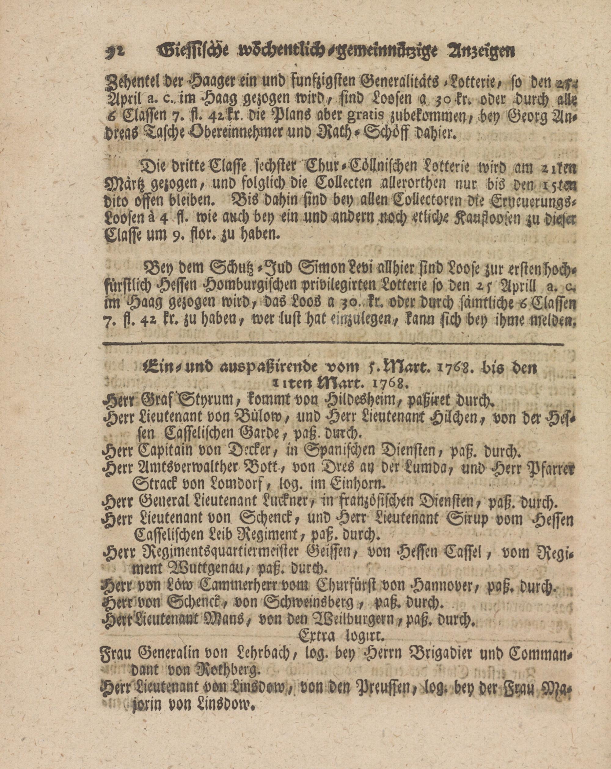 Bey dem Schutz -Jüd Simon Levi allhier sind Loose zur rrstenhoch- fürstlich Hessen Homburgischen privilegirten Lotterie so den zf April! a. c. im Haag gezogen wird/ das Loos a 30. fr. oder durch sämtliche s Classen 7. fl. 42 kr. zu haben, wer tust hat einzulegem, kann sich bey ihme melde».