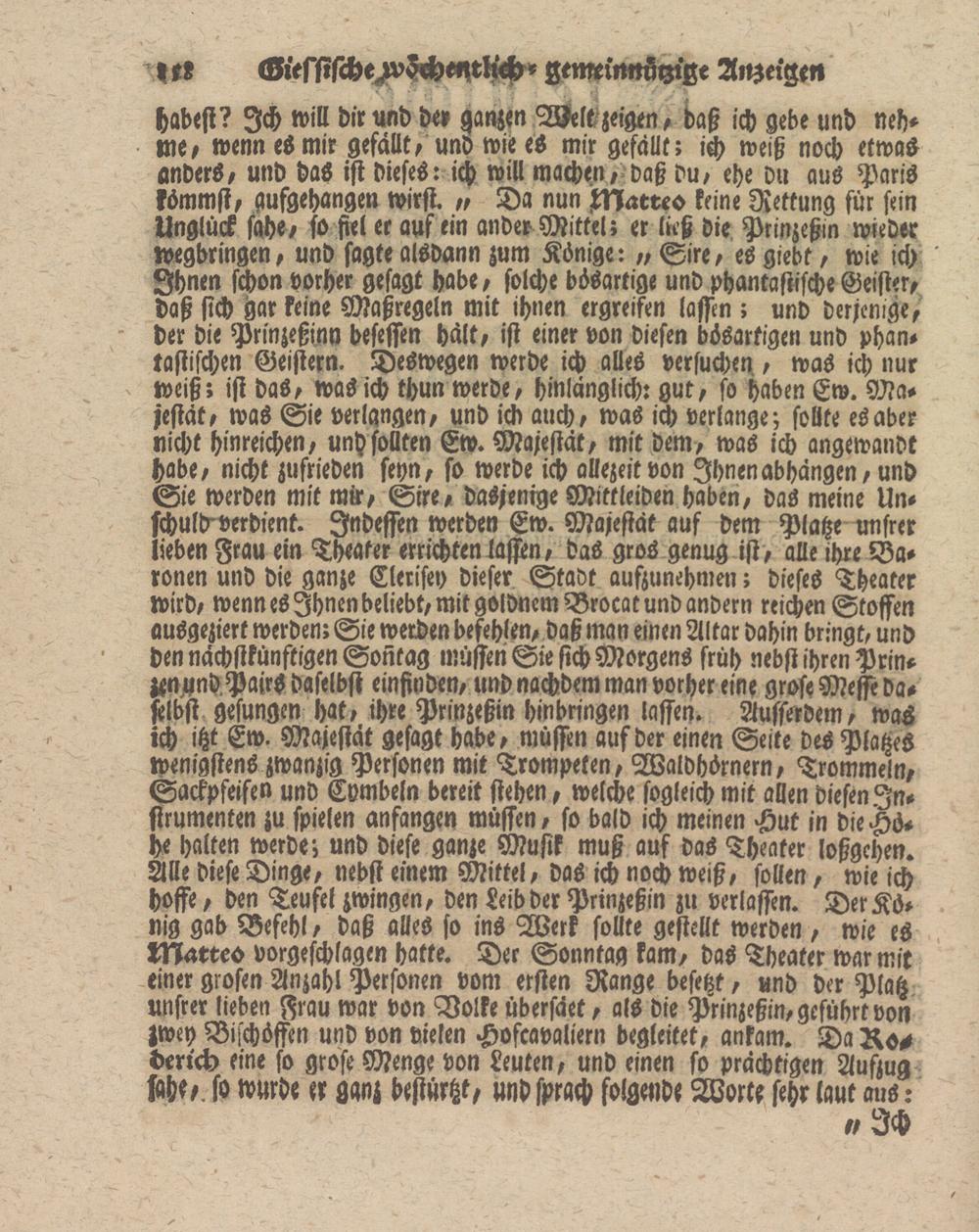 habest? Ich will dir und der ganzen Welezeigen, daß ich gebe und nehme, wenn eS mir gefällt, und wie es mir gefällt; ich weiß noch etwas anders, und das ist dieses: ich will machen, daß du, ehe du aus Paris kömmst, qufgehangen wirst. „ Da nun INaeveo keine Rettung für sein Unglück sähe, so fiel er auf ein ander- Mittel; er küß die Prinzeßin wieder wegbringen, und sagte alsdann zum Könige: „ Sire, es giebt, wie ich Ihnen schon vorher gesagt habe, solche bösartige und phantastische Geister, Daß sich gar keine Maßregeln mit ihnen ergreifen lassen ; und derjenige, der die Prinzeßinn besessen halt, ist einer von diesen bösartigen und phantastischen Geistern. Deswegen werde ich alles versuchen, was ich nur weiß; ist das, was ich thun werde, hinlänglich: gut, so haben Ew. Majestät, was Sie verlangen, und ich auch, was ich verlange; sollte es aber nicht hinreichen, unh sollten Ew. Majestät, mit dem, was ich angewandt habe, nicht zufrieden seyn, so werde ich allezeit von Ihnen abhängen, und Sie werden mit mir, Sire, dasjenige Mittleiden haben, das meine Unschuld-verdient. Indessen werden Ew. Majestät auf dem Platze unsrer lieben Frau ein Theater errichten lasiLn, das gros genug ist, alle ihre Baronen und die ganze Clerisey dieser Stadt aufzunehmen; dieses Theater wird, wenn es Ihnen beliebt, mit goldnem Brocat und andern reichen Stoffen ausgeziert werden; Sie werden befehlen, daß man einen Altar dahin bringt, und den nächstkünftigen Sontag müssen Sie sich Morgens früh nebst ihren Prin- MundPairs daselbst einfinden, und nachdem man vorher eine grose Messe daselbst gesungen hat, ihre Prinzeßin hinbringen lassen. Ausserdem, was ich itzt Ew. Majestät gesagt habe, müssen auf der einen Seite des Platzes wenigstens zwanzig Personen mit Trompeten, Waldhörnern, Trommeln, Sackpfeifen und Cvmbeln bereit stehen, welche sogleich mit allen diesen Instrumenten zu spielen anfangen müssen, so bald ich meinen Hut in die Höhe halten werde; und diese ganze Musik muß auf das Theater loßgehen. Alle diese Dinge, nebst einem Mittel, das ich noch weiß, sollen, wie ich hoffe, den Teufel zwingen, den Leib der Prinzeßin zu verlassen. Der König gab Befehl, daß alles so ins Werk sollte gestellt werden, wie es Matteo vorgeschlagen hatte. Der Sonntag kam, das Theater war mit einer grosen Anzahl Personen vom ersten Range besetzt, und der Platz unsrer lieben Frau war von Volke übersäet, als die Prinzeßin, geführt von Zwey Bischöffen und von vielen Hofcavaliern begleitet, ankam. Da Ko# derrch eine so grose Menge von Leuten, und einen so prächtigen Auszug Mo. so wurde er ganz bestürtzt, und sprach folgende Worte sehr laut aus