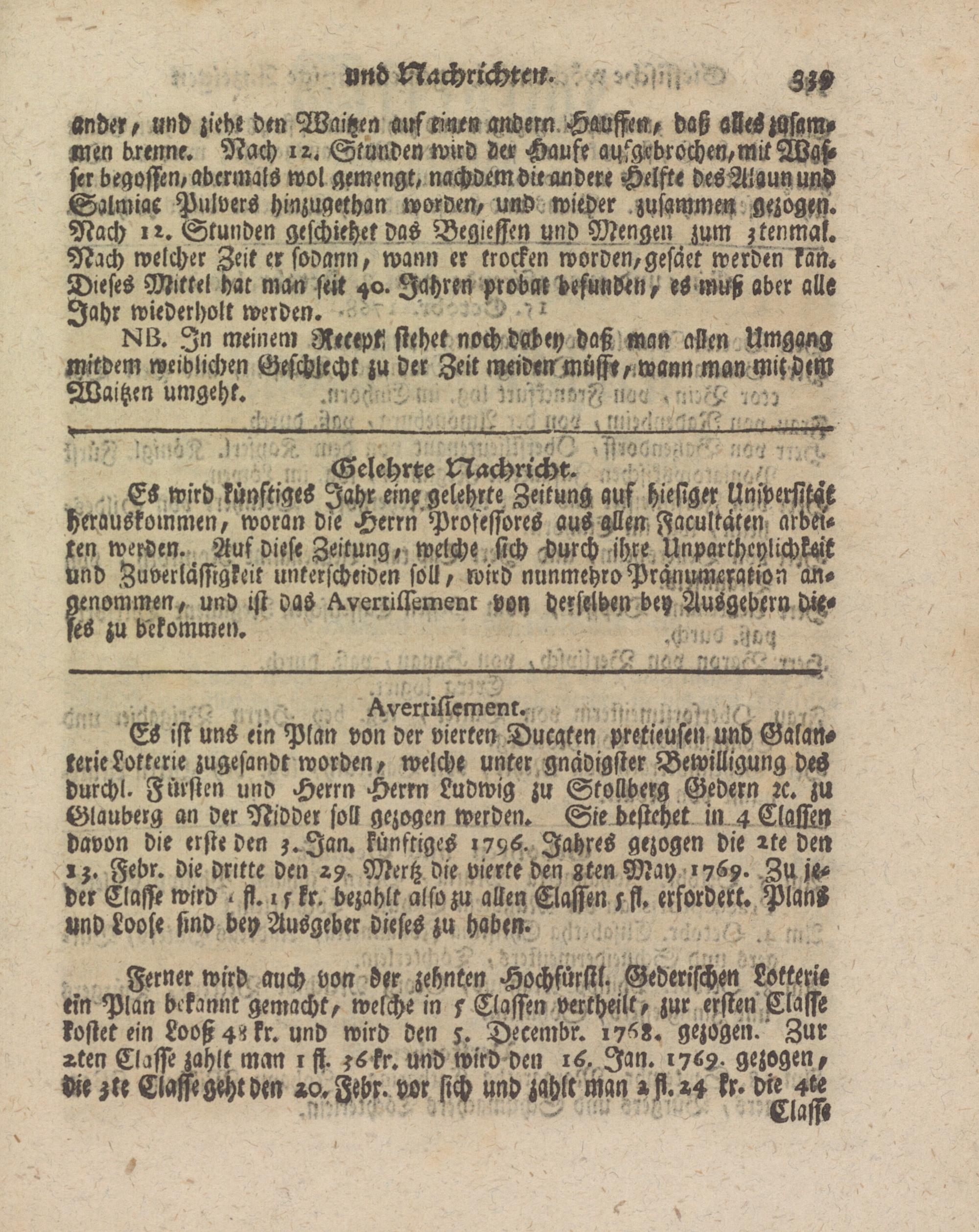 Es ist uns ein Plan von der vierten Ducqten pretieusen und Galanterie Lotterie zugesandt worden, welche unter gnädigster Bewilligung dech durchl. Fürsten und Herrn Herrn Ludwig zu Stollberg Gedern re. zu Glauberg an der Nidder soll gezogen werden. Sie bestehet in 4 ClgM davon die erstehen z.Jan. künftiges »796. Jahres gezogen die rte den >z. Febr. die dritte den 2.9 Wier$ die vierte den zten May 1769. jeder Classe wird < fl. r f kr. bezahlt also zu allen Elasten 5 ff, erfordert. Plan- und Loose sind bey Ausgeber dieses zu haben»