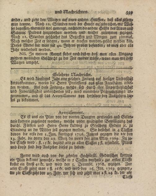Ferner wird auch von Ser zehnten Hochsürstt. Gederischen Lotterie ein Plan bekannt gemacht, welche in $ Elasten vertbeih, zur ersten Classe kostet ein Looß4^kr. und wird den 5. Hecembr. 17^8. gezogen.' Zur rten Classe zahlt man 1 ff. ts kr. und wird den 16. Jan. 1769 gezogen, töt ztt Claffegchtden Lv.Febr. v^r sich und zahlt man rff. r4 fr. die 4U