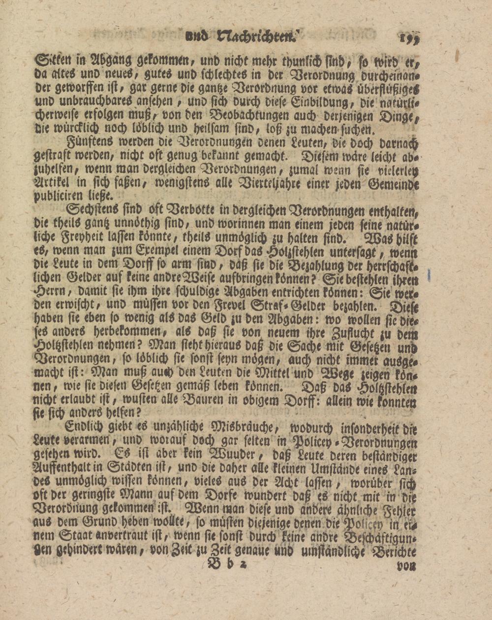 Endlich giebt es unzahliche Misbrauche, wodurch insonderheit dir Leute verarmen, und worauf doch gar selten in Policey -Verordnungen gesehen wird. Es ist aber kein Wuuder, daß Leute deren beständiger Auffenthalt in Städten ist, und die daher alle kleinen Umstände eines Landes unmöglich wissen können, vieles aus der Acht lassen, worüber sich oft der geringste Mann auf dem Dorfe wundert daß es nicht mit in die Verordnung gekommen :st. Wenn man diese und andere ähnliche Fehler aus dem Grund heben wollte, so müsten diejenige denen die Policey in ix* nein Staat anvertraut ist, wenn sie sonst durch keine andre Beschäftige- Sen gehindert wären, von Zeit zu Zeit genaue und umständliche Berichte