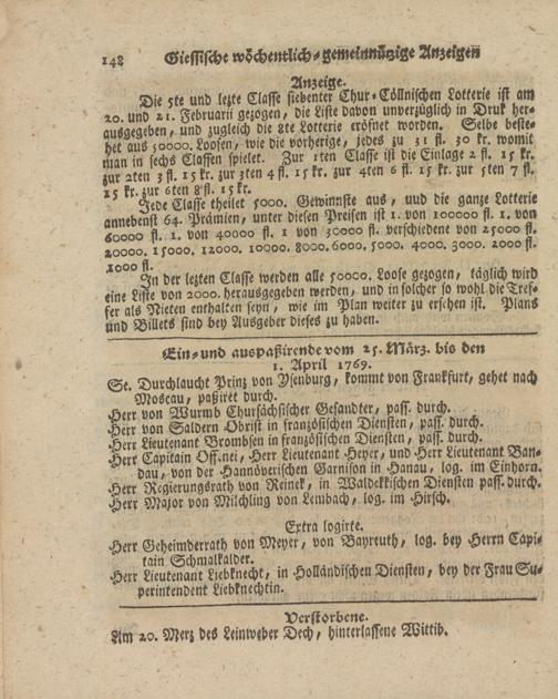 Dau, 6on der Hannöverischen Garnison in Hanau, log. im Einhorn. Herr Regierungsrath von Reinek, in Waldckkischen Diensten pass, durch. Herr Major von Milchling von Lembach, log. im Hirsch.