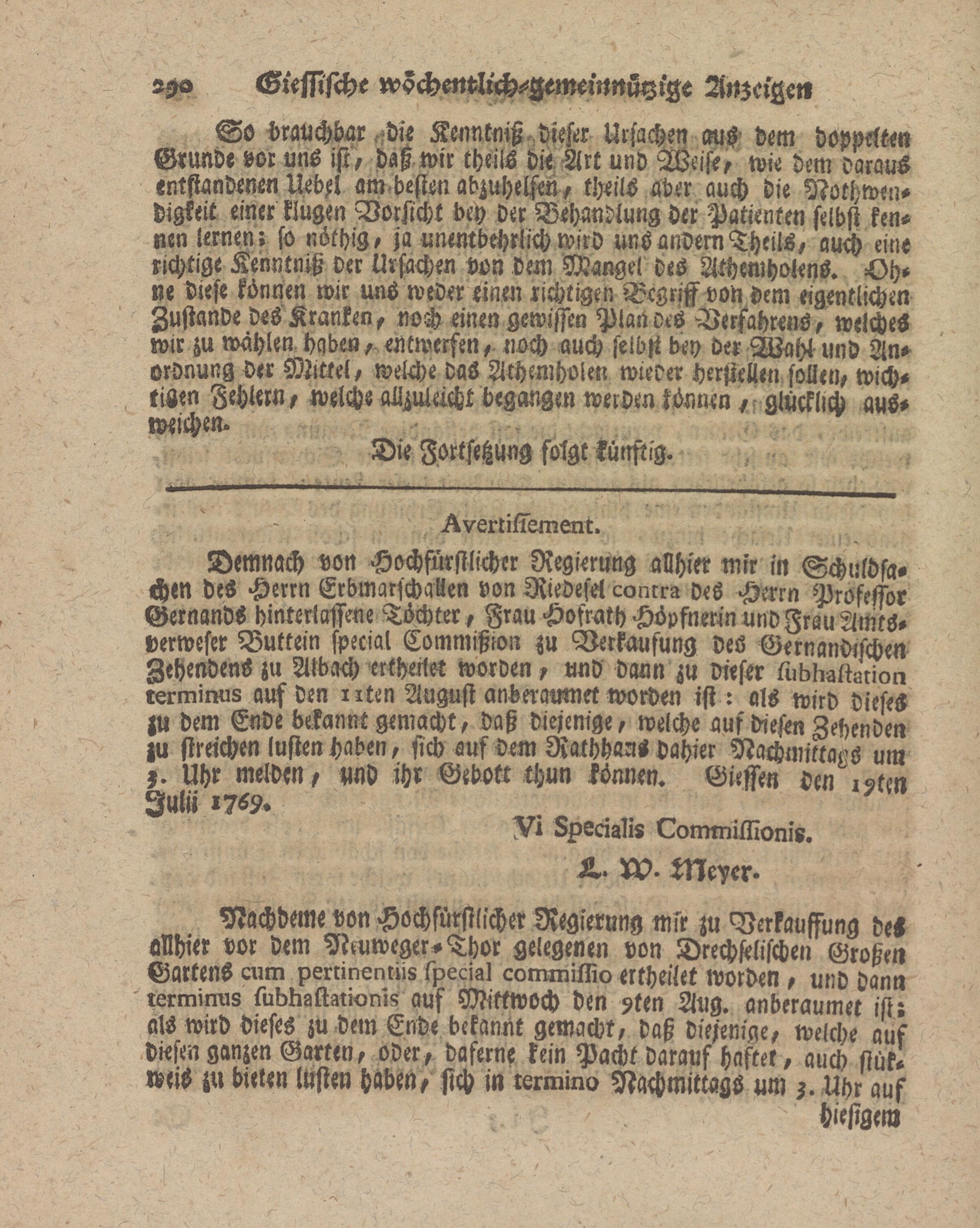 Demnach von Hochfürstlicher Regierung allhier mir in Schuldfa- chen des Herrn Erbmarichallen von Riedesel contra des Herrn Professor Gernands hinterlassene Töchter / Frau Hofrath Höpfnm'n und Frau AmkS- verweser Bütteln special Commißron zu Verkausung des Gernandtfchen Zehendens zu Albach ertheilet worden, und dann zu dieser fubhaftation terminus auf den Uten August an beraumet worden ist : als wird dieses M dem Ende bekannt gemacht, daß diejenige, welche auf diesen Zehenden zu streichen lüsten haben, sich auf dem RathhanS dahier Nachmittags um z. Uhr melden/ und ihr Gebott thun können. Giessen den istm Sulii iW*