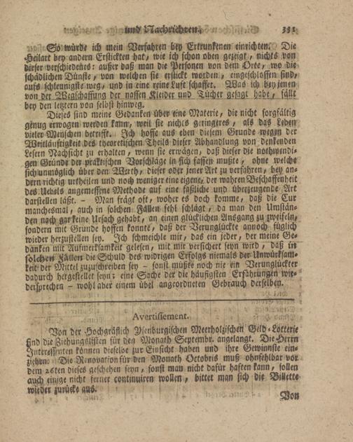 Dieses sind meine Gedanken über eine Matme, die Nicht sorgfältig genug erwogen werden kann', weil sie nichts geringeres, als das Leben vieler Menschen betrifft. Ich hoffe aus eben diesem Grunde wegen der Wntläuftigkeik.des theoretischen Theils dieser Abhandlung von denkenden Lesern Nachsicht zu erhalten, wenn sie erwägen, daß dieser die nokhwmdi- aen Gründe der praktischen Vorschläge in sich fassen mußte, ohne welche sich unmöglich über den Werth, dieser oder jener Art zu verfahren, bey andern richtig urtheilen und noch weniger eine eigene, der wahrenBeschaffenheit des UebelS angemessene Methode auf eine faßliche und überzeugende Art darstellen läßt. - Man fragt oft, woher es doch komme, baß dre Cur manchesmal, auch in solchen Fällen fehl schlägt, da man den Umstanden nach gar keine Ucsach gehabt, an einen glücklichen Ansgang zu zweifeln, sondern mit Grunde hoffen konnte, daß der Verunglückte annoch füglich wieder herzustellen sey. Ich schmeichle mir, das ein jeder, der meine Gedanken mit Aufmerksamkeit gelesen, mit mir versichert seyn wird , daß m folgert Fällen die Schuld des widrigen Erfolgs niemals der Unwurksam- keid der Mittel zuzuschreiben sey - sonst müßte noch nie ein Verunglückter dadurch h-rg-st-lltt seyn; eine Sache der die häufigsten Erfahrungen reit« besprechen - wohl aber einem übel angeordnelen Gebrauch derselben.