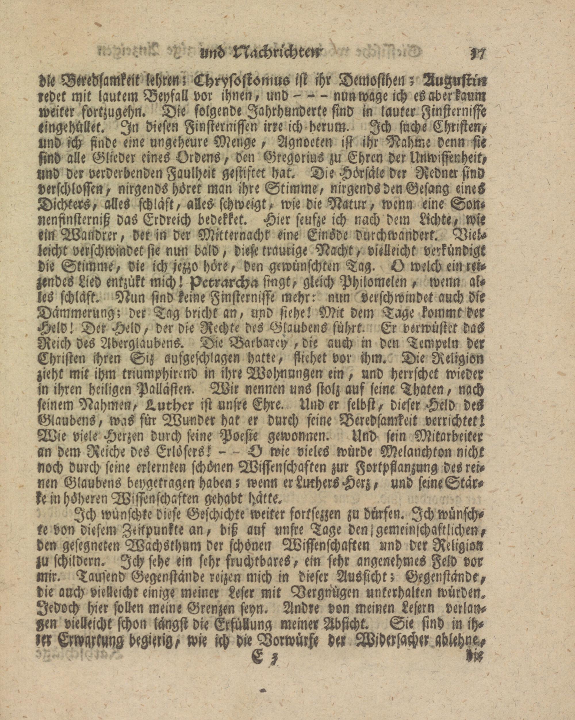weiter forkzugchn. Die folgende Jahrhunderte sind in lauter Finsternisse ringe hüllet. In diesen Finsternissen irre ich herum. Ich suche Christen und ich finde eine ungeheure Menge, Agnoeten ist ihr Nähme denn sie find alle Glieder eines Ordens, den Gregorius zu Ehren der Unwissenheit, und der verderbenden Faulheit gestiftet hat. Die Hörsäle der Redner sind verschlossen, nirgends höret man ihre Stimme, nirgends den Gesang eines Dichters, alles schlaft, alles schweigt, wie die Natur, wenn eine Son- uenfinsterniß das Erdreich bedekket. Hier seufze ich nach dem Lichte, wir ein Wandrer, der in der Mitternacht eine Einöde durchwandert. Vielleicht verschwindet sie nun bald, diese traurige Nacht, vielleicht verkündigt die Stimme, die ich jezzo höre, den gewünschten Tag. O welch ein rek- zenves Lied entzükt mich! petrarcha singt, gleich Philomelen , wenn alles schläft. Nun sind keine Finsternisse mehr: nun verschwindet auch die Dämmerung; der Tag bricht an, und siehe! Mik dem Tage kommt der Held! Der Held, der die Rechte des Glaubens führt. Er verwüstet daS Reich des Aberglaubens. Die Barbarey , die auch m den Tempeln der Christen ihren S'Z aufgeschlagen hatte, fliehet vor ihm. Die Religion zieht mit ihm triumphircnd in ihre Wol-rmngen ein, und herrschet wieder in ihren heiligen Pallästen. Wir nennen uns stolz auf seine Tbaten, nach seinem Nahmen, Luther ist unsre Ehre. Und er selbst, dieser Held des Glaubens, was für Wunder hat er durch feine Beredsamkeit verrichtet! Wie viele Herzen durch seine Poesie gewonnen. Und sein Mitarbeiter an dem Reiche des Erlösers! - - O wie vieles würde Melanchton nicht noch durch seine erlernten schönen Wissenschaften zur Fortpflanzung des reinen Glaubens ber-getragen haben; wenn erLmhersHerz, und seineStar- ke in höheren Wistenschaften gehabt hätte.
