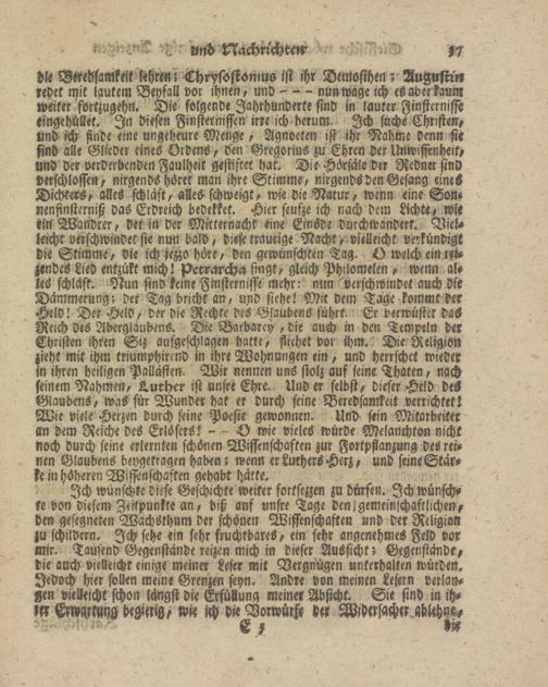 Ich wünschte diese Geschichte weiter fortsezzen zu dürfen. Ich wünschte von diesem Zeitpunkte an, biß auf unsre Tage denjgemeinlchaftlichen, den gesegneten Wachsthum der schönen Wissenschaften und der Religion zu schildern. Ich sehe ein sehr fruchtbares, em sehr angenehmes Feld vor mir. Tausend Gegenstände reizen mich in dieser Aussicht; Gegenstände, die auch vielleicht einige meiner Leser mit Vergnügen Unterhalten würden. Jedoch hier sollen meine Grenzen seyn, Andre von meinen Lesern verlay- Ken vielleicht schon längst die Erfüllung meiner Absicht. Sie sind in i> M Errmtuyg deMig, wie ich pieVorwüch der Widersacher Mhm,